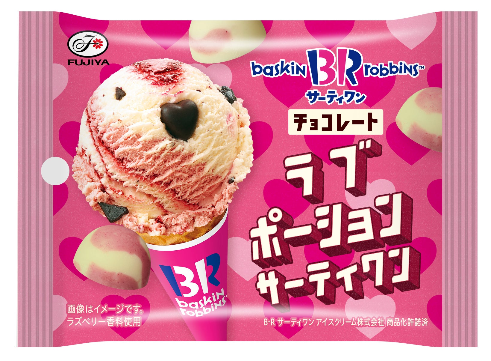・甘酸っぱいラズベリー風味の生地とホワイトチョコをマーブル状に仕上げ、ラブポーションサーティワンの見た目と味わいを表現