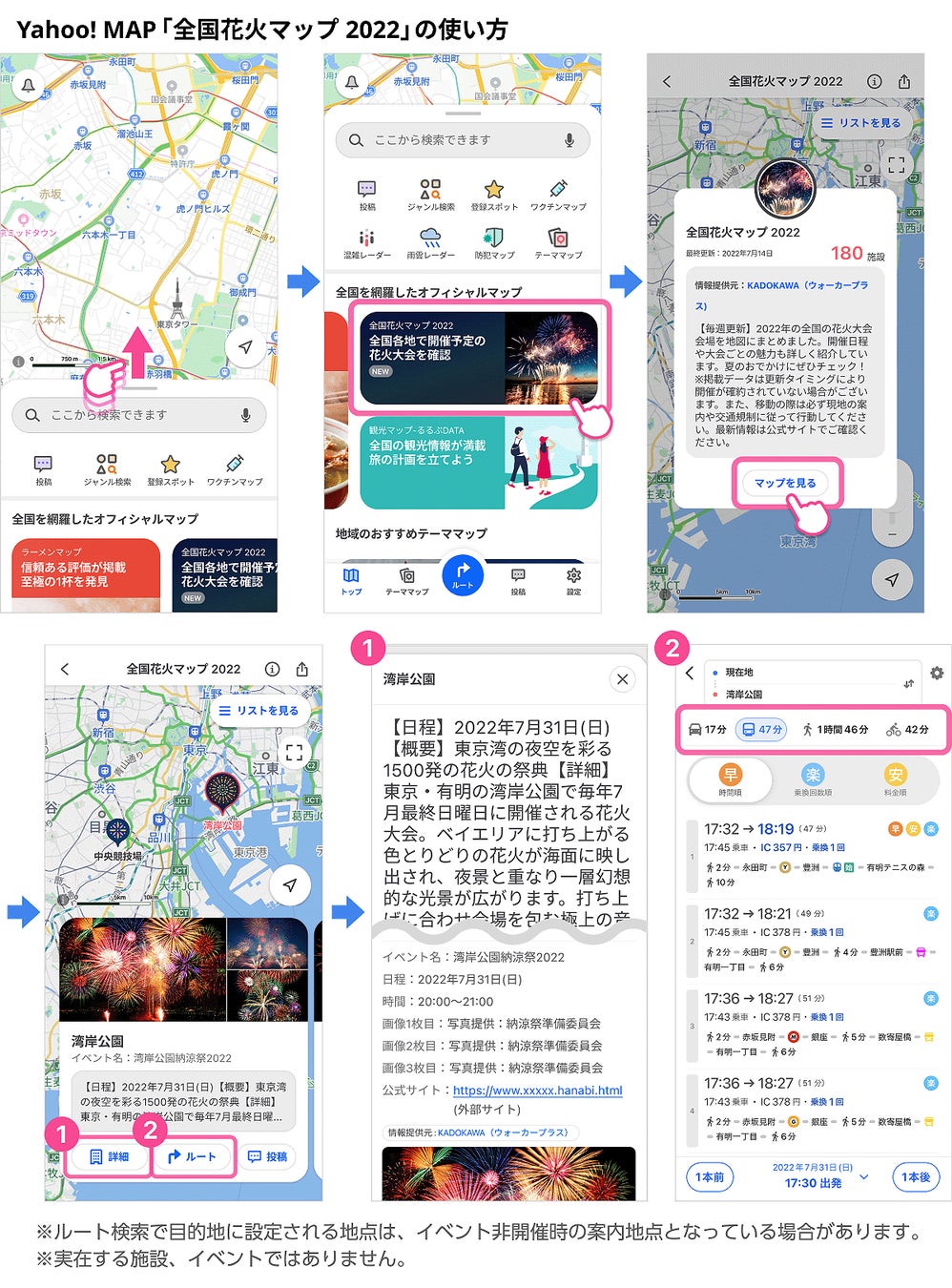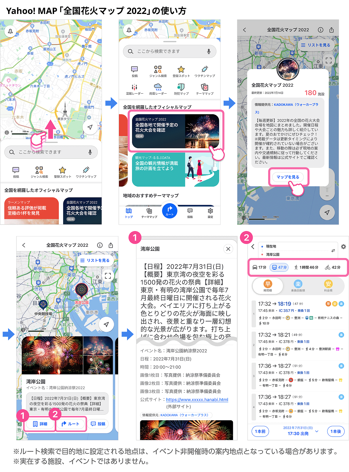 ユーザーは「Yahoo! MAP」を起動後、「全国花火マップ 2022」ボタンをタップ、または画面下部を引き上げて「全国花火マップ 2022」カードをタップするだけで、地図上で該当スポットをスムーズに確認できます。また、詳細を確認したい“花火のピン”をタップすると写真・施設名・イベント名・開催日程・概要・詳細も確認できます(※3)。さらに、ルート検索にも対応しているため、該当スポットまでのルートや所要時間も調べることができます。
