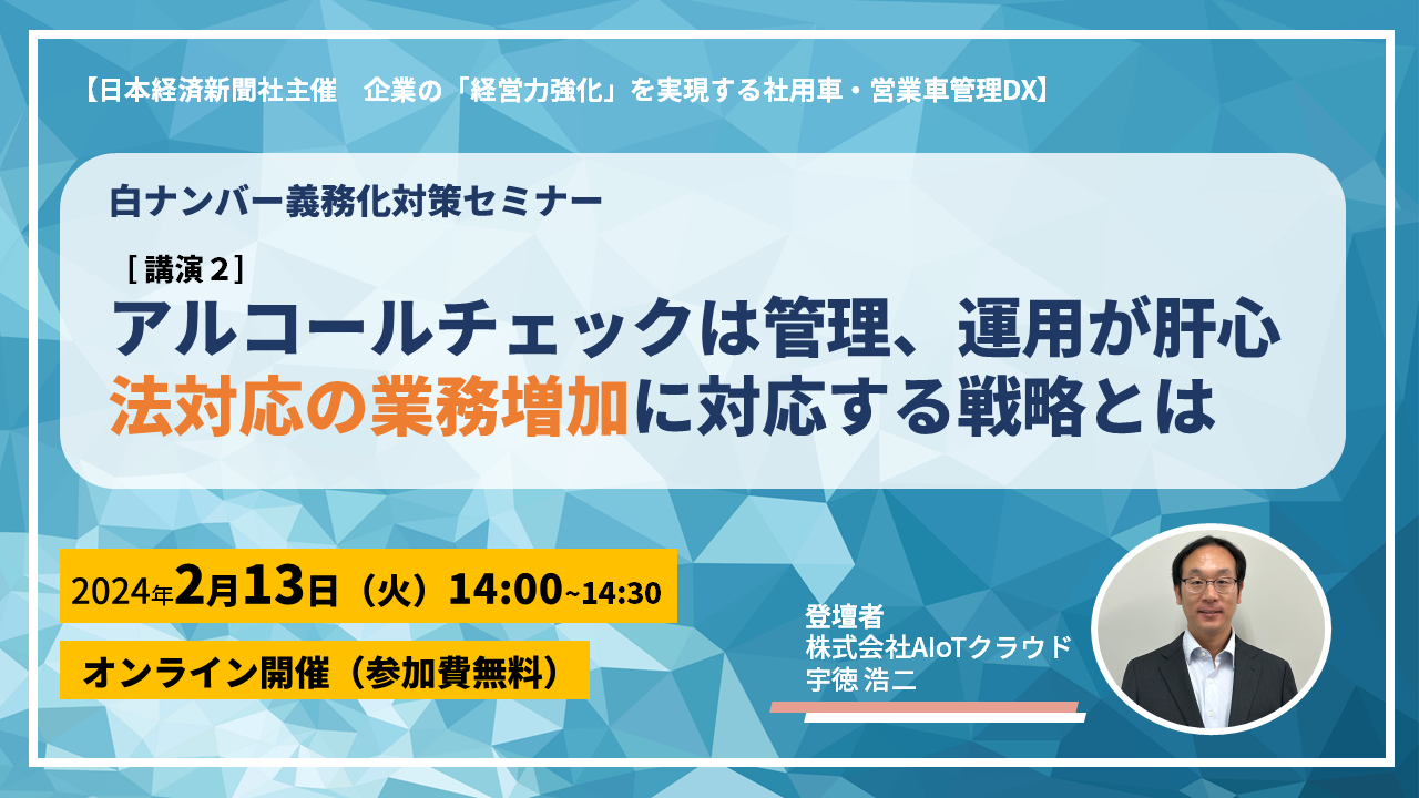 【白ナンバー社用車へのアルコールチェック義務化対策】法対応後の業務増加に対する打ち手は?“企業の「経営力強化」を実現する社用車・営業車管理DX”セミナーにAIoTクラウド事業責任者登壇
