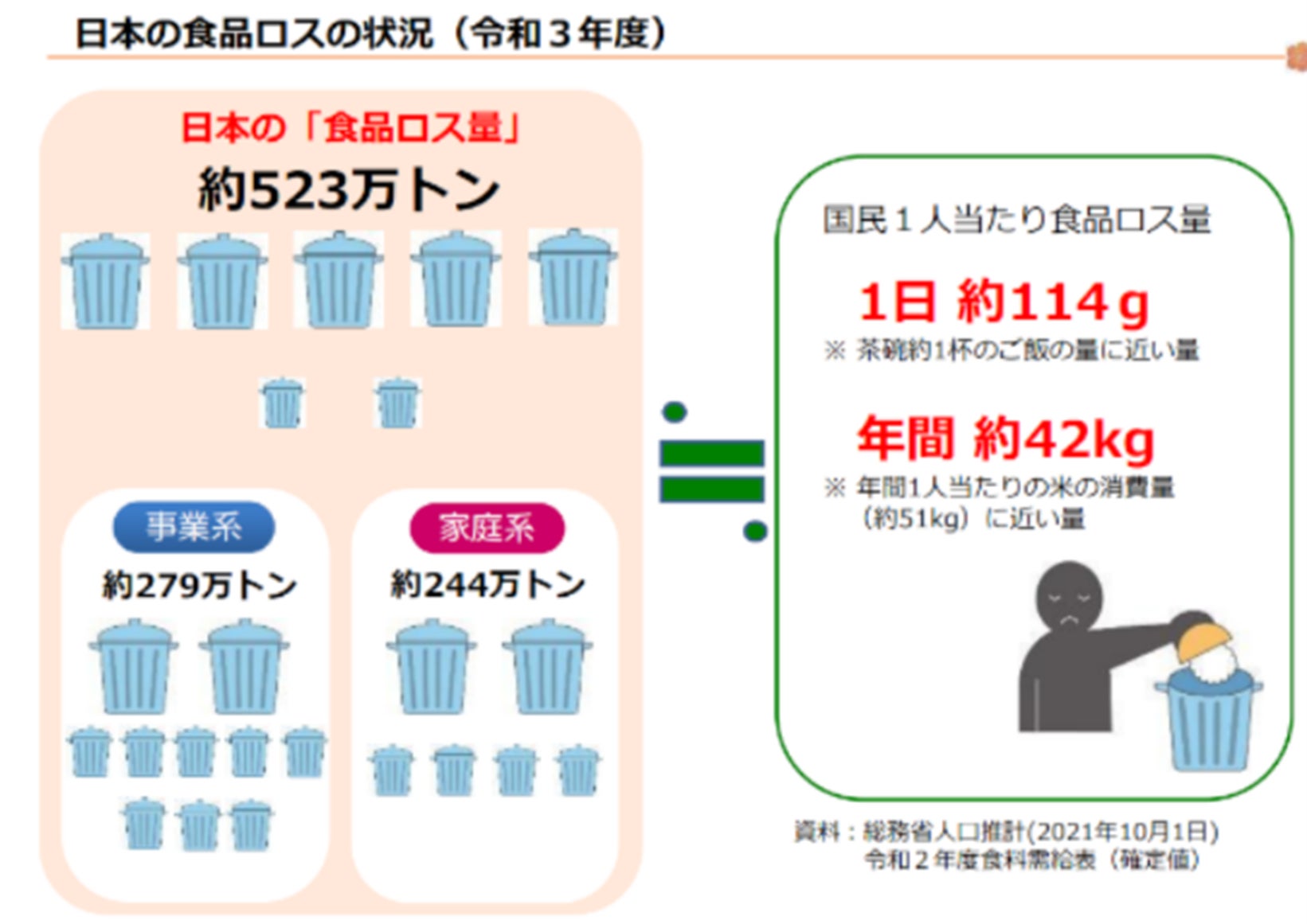 令和3年度の日本の食品ロスは約523万トンで、1人当たりに例えると、茶碗1杯のごはんの量が1日に捨てられていることになります。