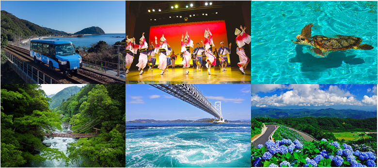 日本人の心の色「阿波藍」。「阿波おどり」や「阿波人形浄瑠璃」、「うだつの町並み」などの情緒溢れる文化。引き込まれそうな大自然の驚異「鳴門の渦潮」。深く切れ込んだ渓谷と翡翠色の川面が輝く「大歩危小歩危」や群青色の山々が連なる秘境「祖谷渓谷」。紺碧の海に世界一のサンゴが花咲く「牟岐大島」やサーフスポットの数々。また、線路と道路の両方を走行する「デュイアル・モード・ビーグル(DMV)」の本格営業運行は、なんと世界初!自然、文化、歴史、食、そして新たな挑戦など、徳島の魅力をぜひご覧ください。