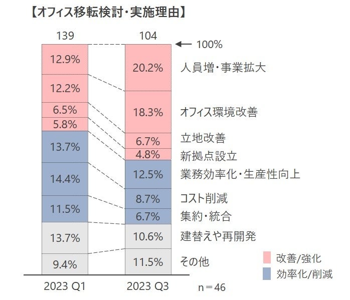 当社にて実施した、「企業の不動産ニーズに関するアンケート調査」によると、オフィス移転理由は、「人員増・事業拡大」と「オフィス環境改善」の割合が増加した。前回調査で多く選ばれた「コスト削減」や「集約・統合」など、「効率化/削減」に関する項目の占める割合が低下し、「改善/強化」に関する項目が上昇した。