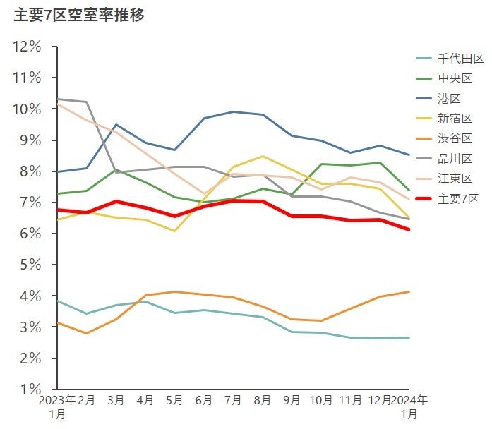 <2024年1月末>東京主要7区 大型オフィスビル空室率・平均募集賃料の動向