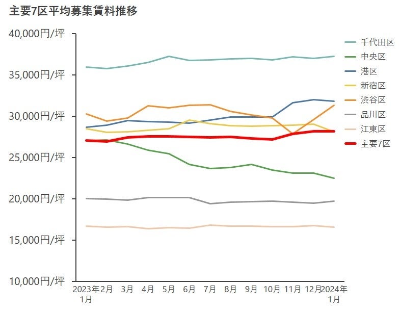 2024年1月末時点の主要7区空室率・平均募集賃料の動向