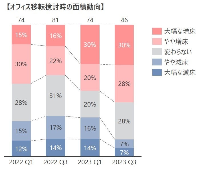 オフィス移転時の面積動向については、「増床」が全体の58%を占めた一方、「減床」は前回から大幅に低下し全体の14%に留まった。2022年Q3以降、「増床」回答の割合は増加傾向となっている。