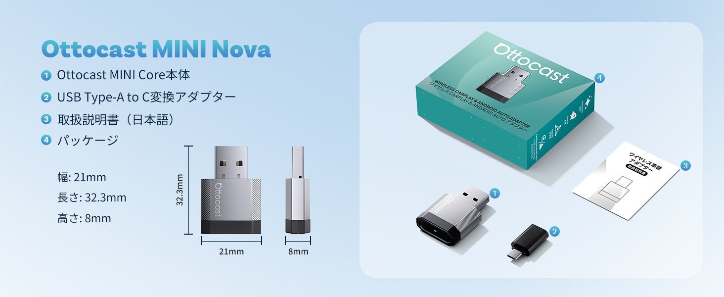 オットキャスト2026年最新モデル登場!5.5g超軽量「Ottocast Mini Nova」挿すだけでCarPlay&Android Autoワイヤレス化!|発売記念40%OFF