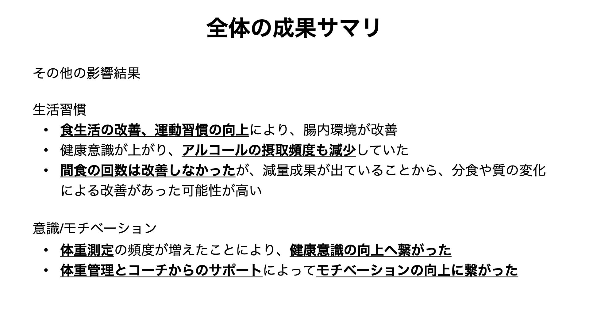 間食の回数は改善しなかったが、減量成果が出ていることから、分食や質の変化による改善があった可能性が高い