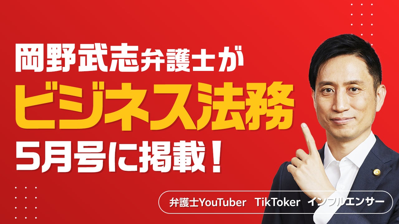 「ビジネス法務」5月号では、岡野弁護士が実践する各SNSプラットフォームの特性を活かした独自のコンテンツ戦略や、SNS活用による具体的な成果を紹介。