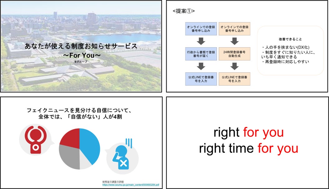 iU学生5チームが参加したグループプレゼン大会では、内閣官房が実施する「冬のDigi田甲子園」の応募事例から1つの事例を選び、取り組みの理解および分析と改善提案を行いました。