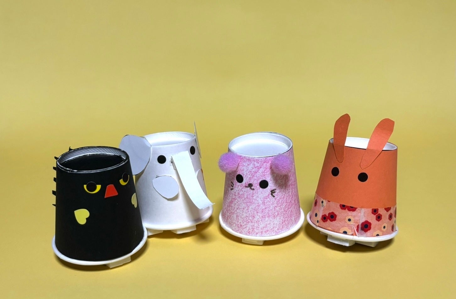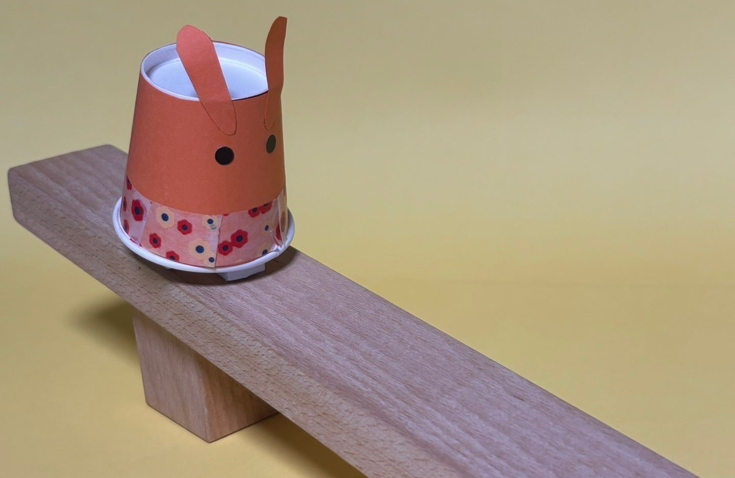 紙コップにデコレーションして自分だけのオリジナル「どうぶつトコトコ」を作り、長い坂道をトコットコッと歩かせて一緒に遊びます。