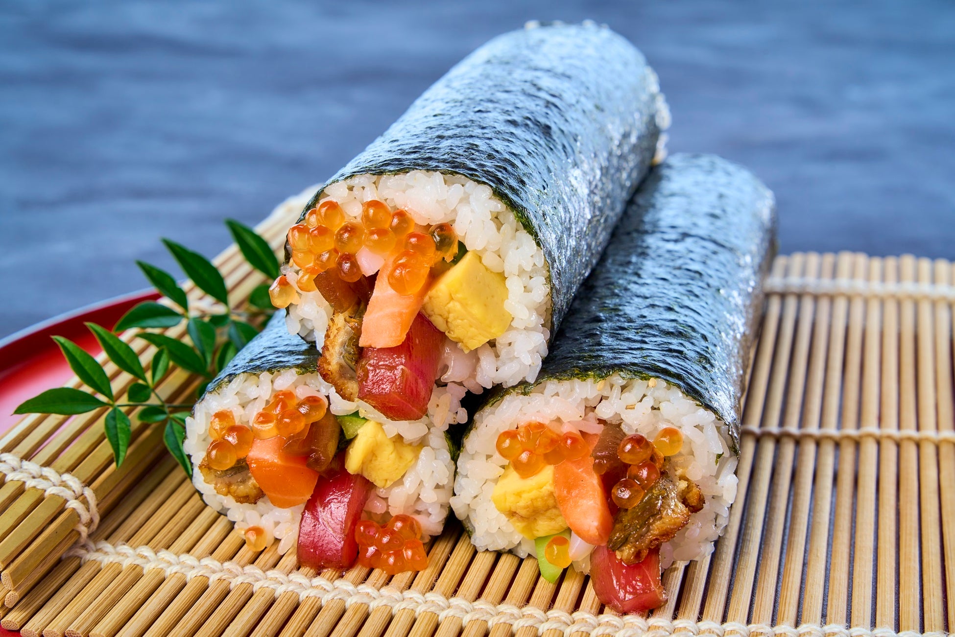 具材は、橋本料理長秘伝の出汁醤油に漬け込んだまぐろに、しっとりと上質な脂ののったうなぎ、酢で〆たサーモン、いくら醤油漬け、あおりいか、金沢港で水揚げされたばかりの甘えびの豪華6種の海鮮に、厚焼き玉子、きゅうり、大葉、かんぴょうの全10種。贅沢に大きく切った具材を大胆に巻き上げていきます。