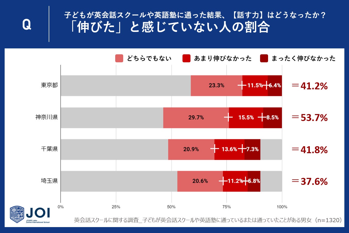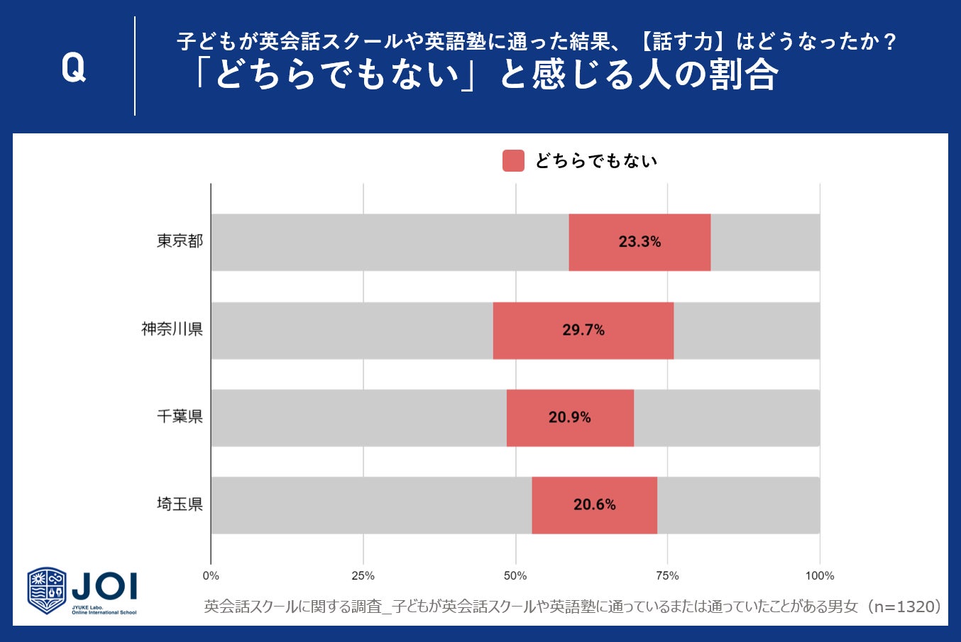 じゅけラボOnlineインターナショナルスクールJOI(所在地:大阪市北区、代表取締役:後藤智則)は、子どもが英会話スクールや英語教室に通っているまたは通っていたことがあると回答した一都三県(東京都330人・神奈川県330人・千葉県330人・埼玉県330人)の親に英会話スクールや英語教室における「英語を話す力(スピーキング力)」の成果に関するアンケート調査を実施しました。