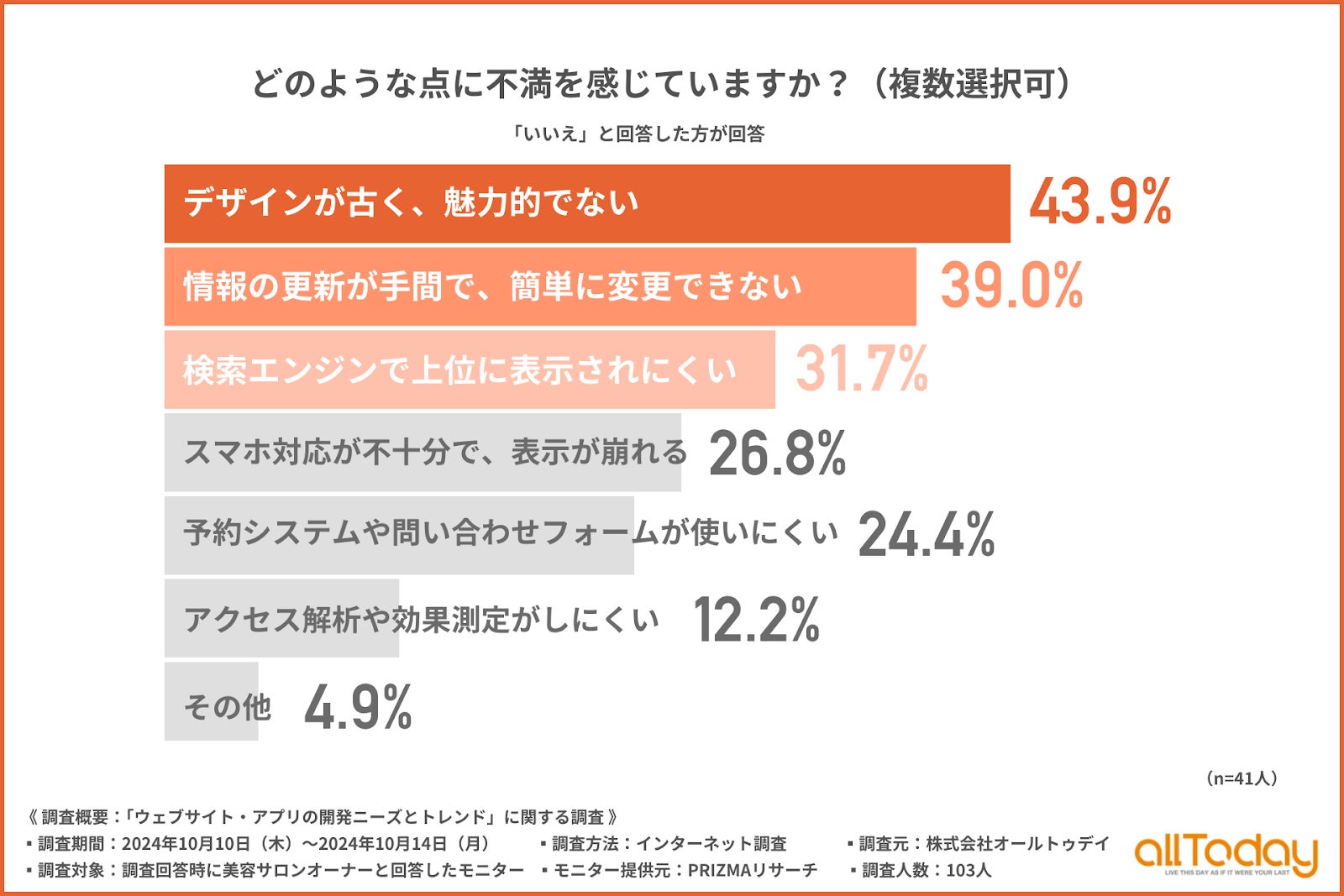 前の質問で「いいえ」と回答した方に、「どのような点に不満を感じていますか?(複数選択可)」と質問したところ、『デザインが古く、魅力的でない(43.9%)』と回答した方が最も多く、次いで『情報の更新が手間で、簡単に変更できない(39.0%)』『検索エンジンで上位に表示されにくい(31.7%)』となりました。