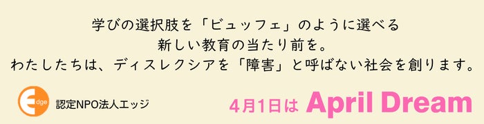 認定NPO法人エッジ(東京都港区 会長:藤堂栄子)は、4月1日の「April Dream」にあわせ、読み書きに困難がある「ディスレクシア」の人々が、その特性を「障害」ではなく「才能」として発揮できる社会の実現を宣言します。