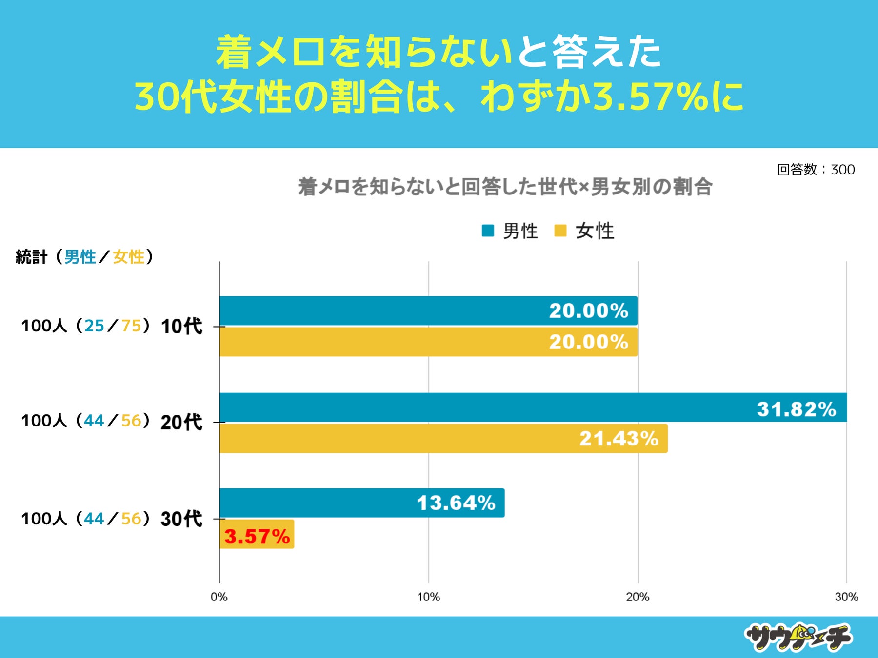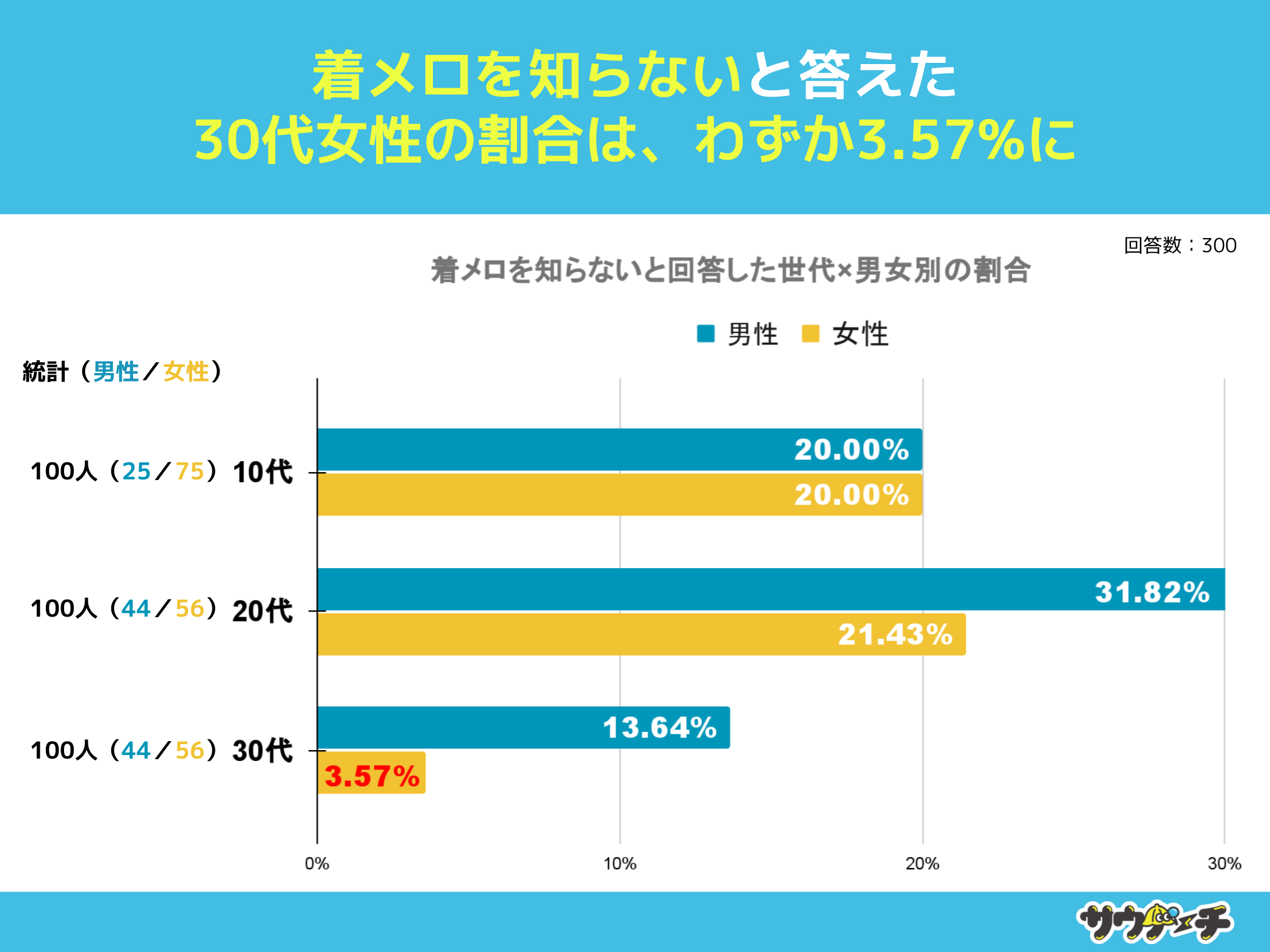着メロを知らないと回答した割合を世代×男女別でみてみますと、20代男性の約32%が最も高く、次いで20代女性の約21%、10代が男女共に20%、30代男性が約14%、30代女性が約4%という結果になりました。