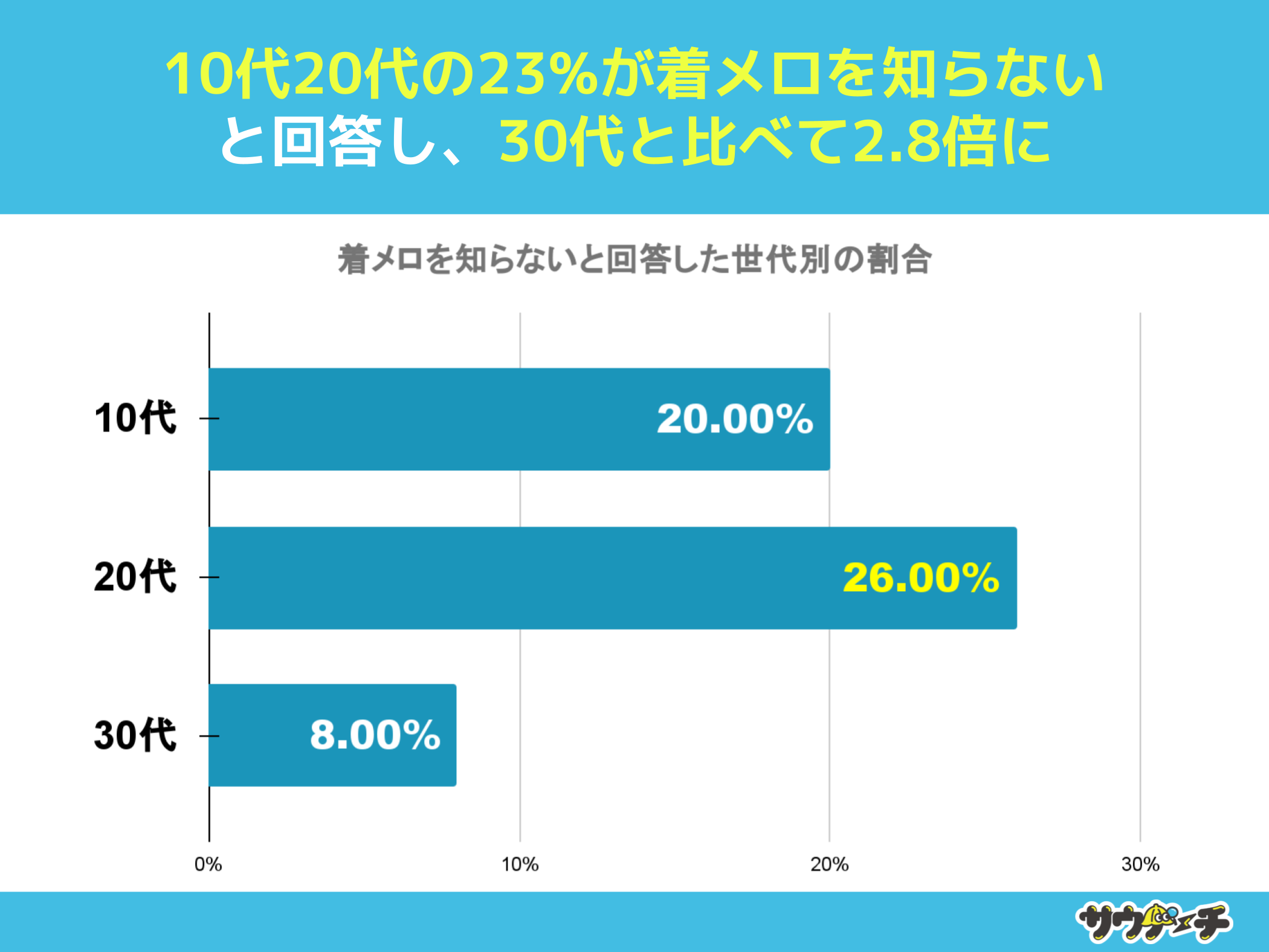 着メロを知らないと回答した割合を世代別でみてみますと、20代の26%が最も高く、次いで10代の20%、30代が8%で、30代と比べて10代20代の平均は2.8倍高い結果となりました。