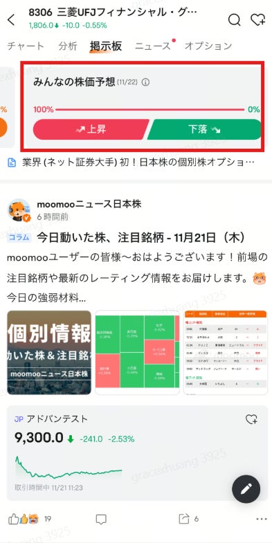moomoo証券株式会社(ムームー、本社:東京都渋谷区、代表取締役社長:伊澤フランシスコ、以下「moomoo証券」)はこの度、アプリ内の投資家コミュニティ機能を「Moo」から「掲示板」へ改名し、「みんなの株価予想」機能を追加いたしました。この新機能では、投票に参加することで、他の投資家による個別株や株価指数に対する翌日の予測をリアルタイムで確認することができます。