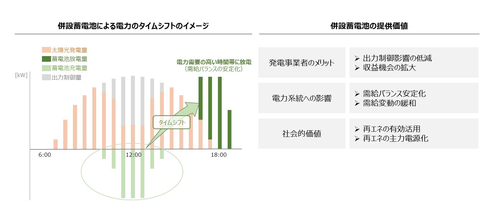 NTTアノードエナジーは、既設の太陽光発電所に蓄電池を併設し、これまで出力制御の対象となっていた時間帯の電力を一時的に充電し、電力需要が高い時間帯や市場価格の高い時間帯に放電・供給することで、再生可能エネルギー(以下、再エネ)の有効活用を進めていきます。電力需給バランスの不一致や系統混雑(送電容量の制約等)に起因する出力制御により、発電電力量が十分に活用されないという課題の解決に取り組み、電力の安定供給に寄与してまいります。