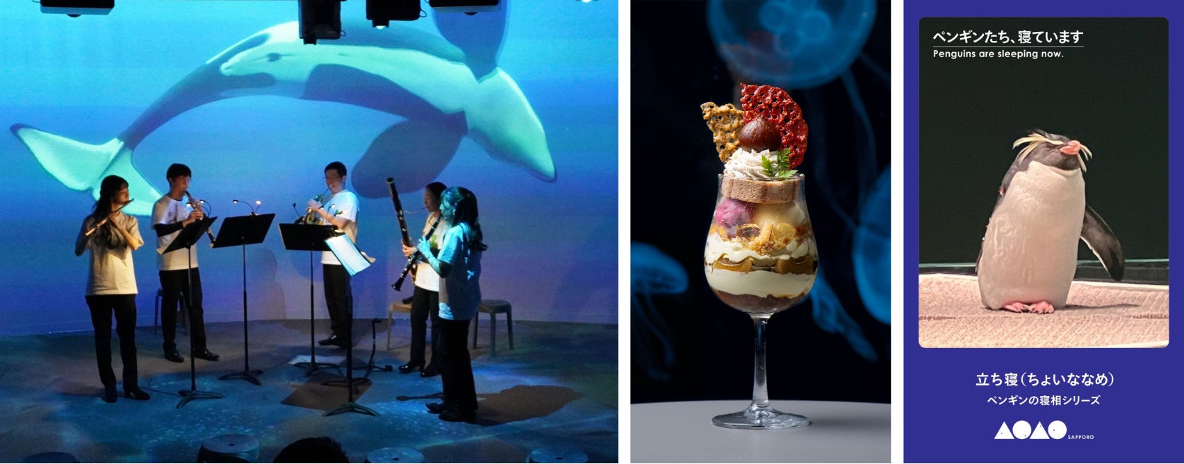 札幌発祥の夜の文化「シメパフェ」とともに、ペンギンなどの生物の観察をお楽しみください。