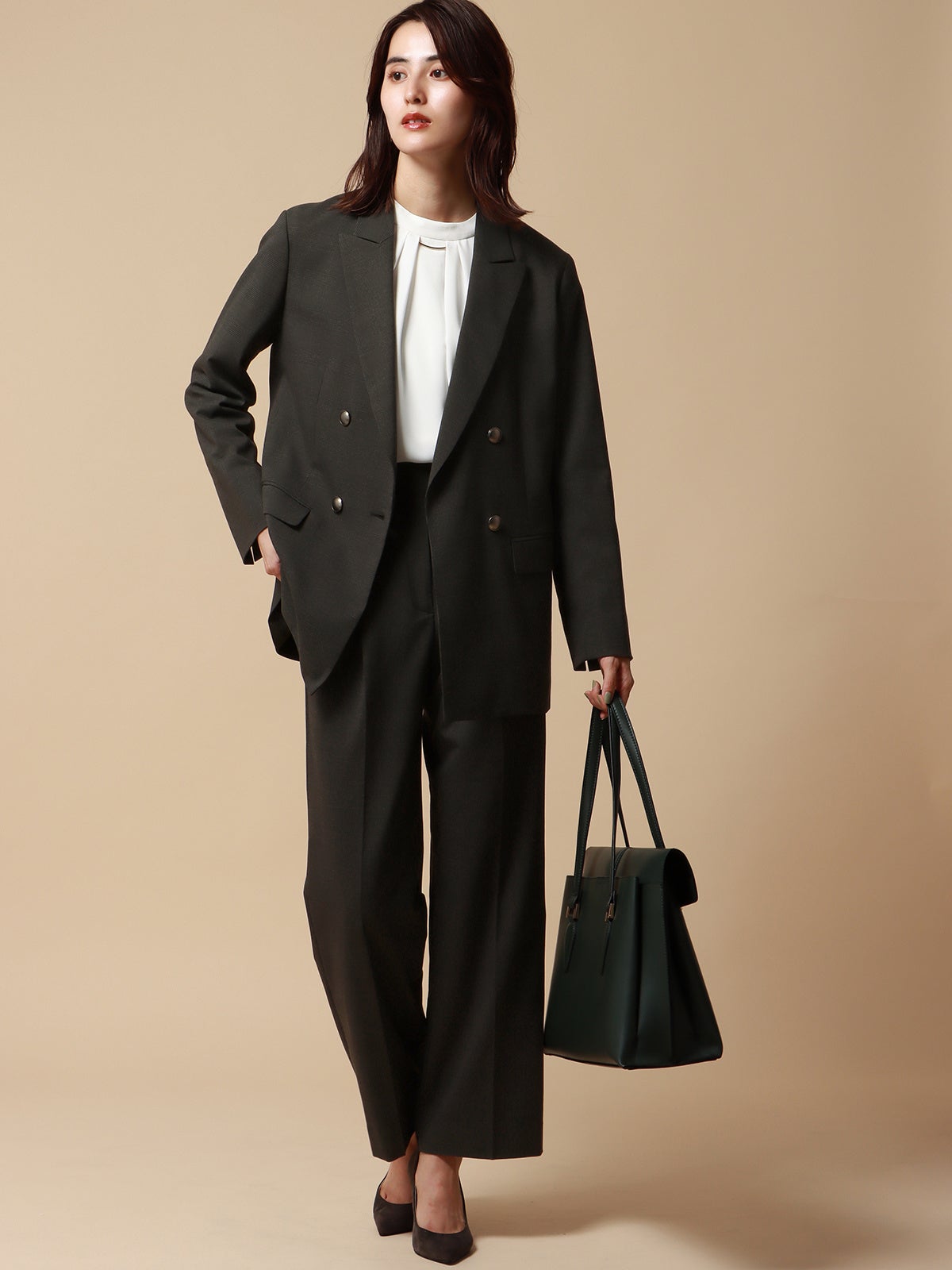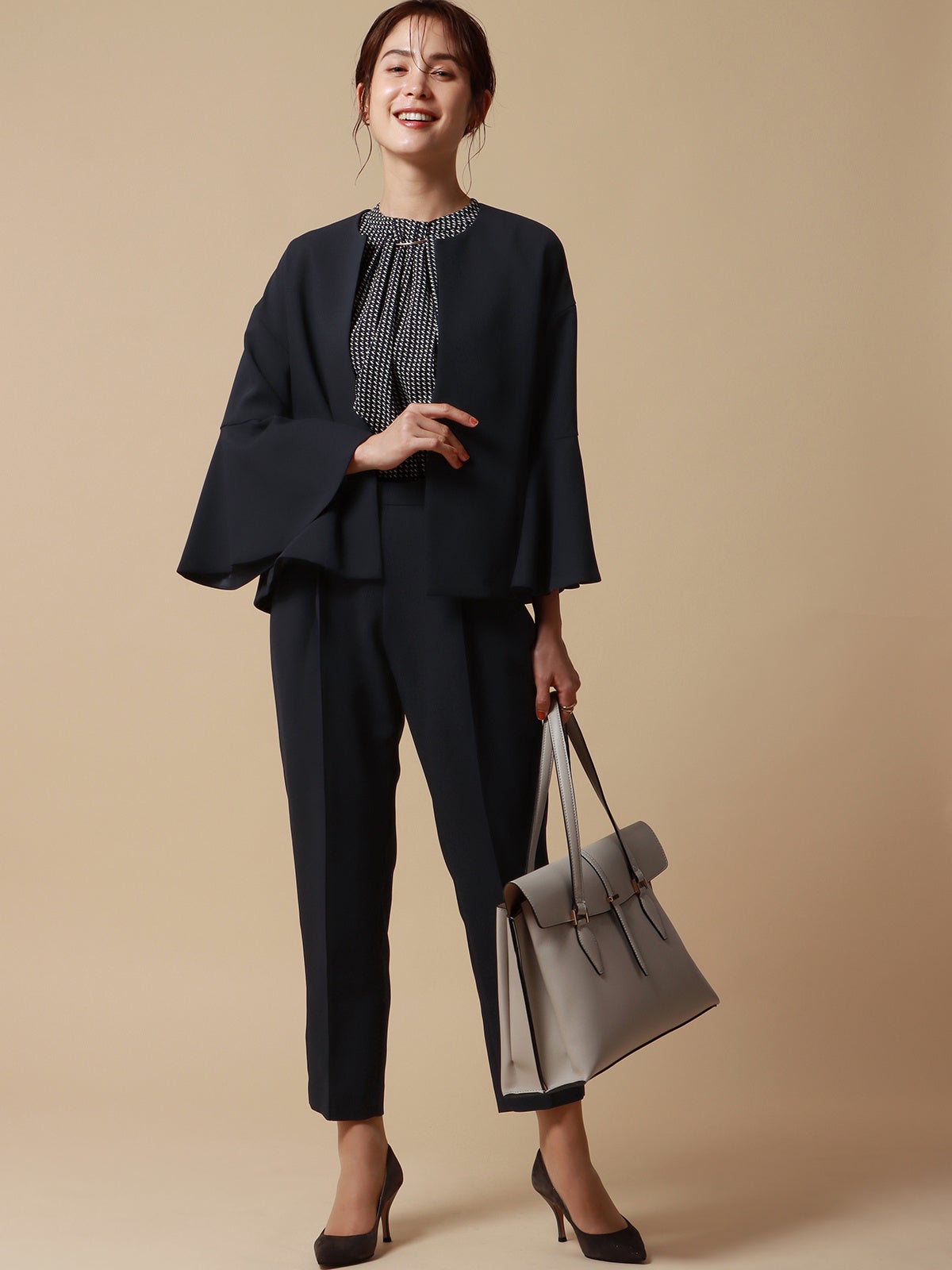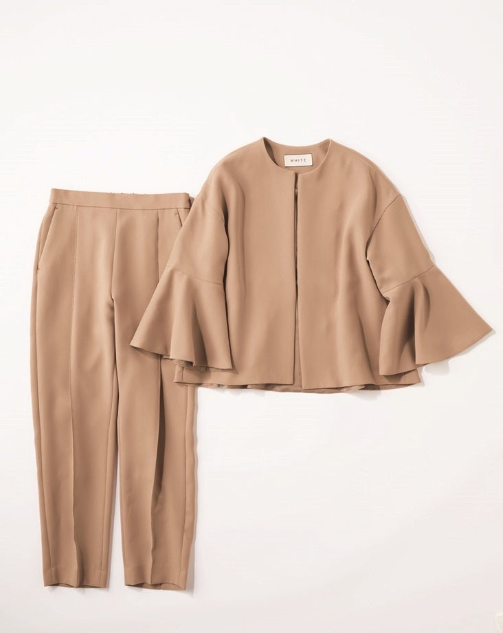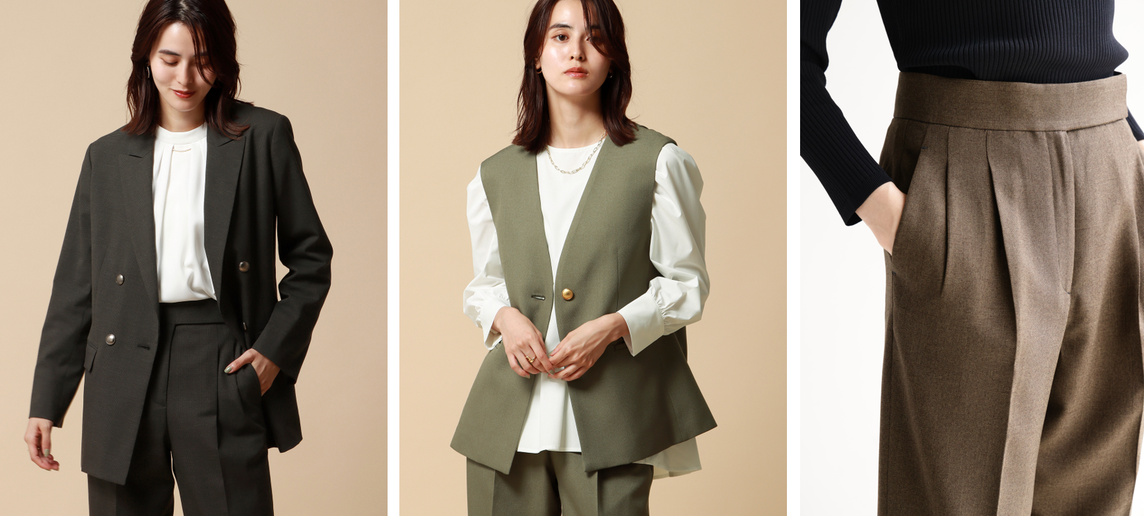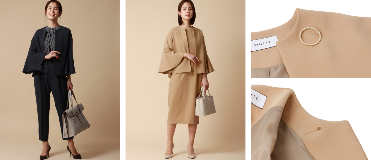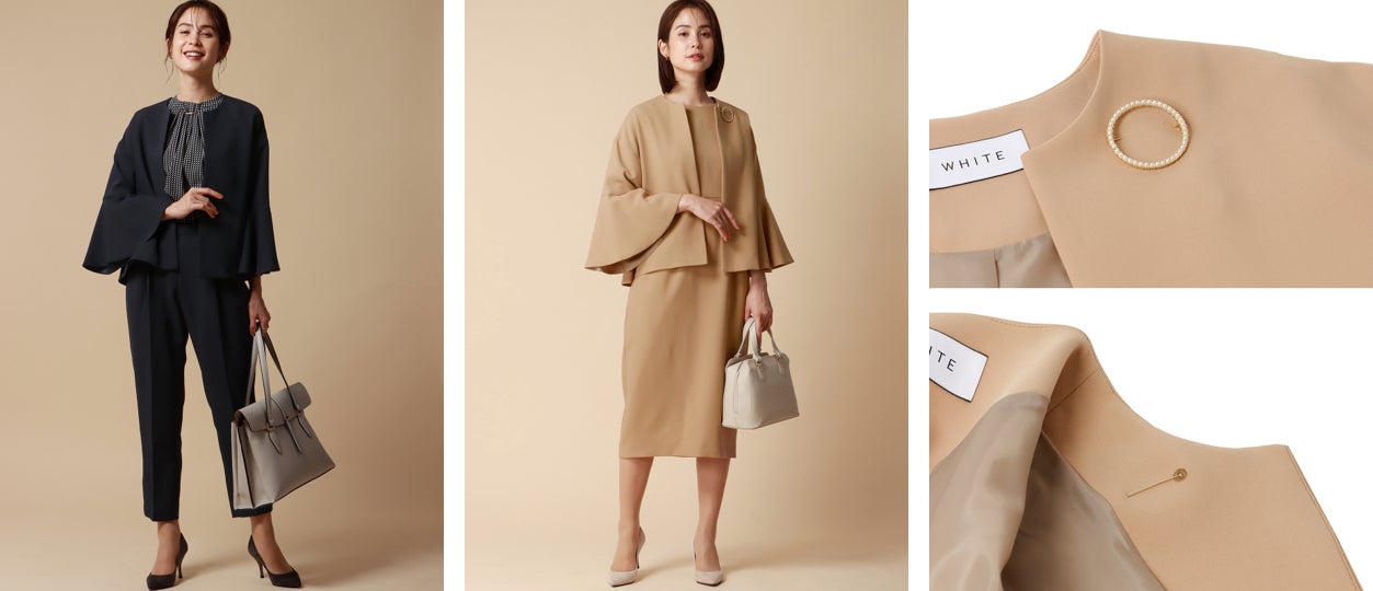 「ハンサムスーツスタイル」では、ジャケット・ジレ・パンツの3アイテムを用意。ジャケットとジレは身体のラインをひろいすぎず、程よくゆとりのあるボクシーシルエットになっているので、マニッシュな雰囲気で着用できます。また、TPOに合わせてボタンを付け替えられるチェンジボタン仕様になっています。パンツは、2タックのワイドパンツで大人っぽさを演出し、太めのウエストベルトが足長効果を実現してくれます。「華やぎオケージョンスタイル」では、ジャケット・ワンピース・パンツの3アイテムを用意。ジャケットとワンピースは袖をフレアにすることで華やかで柔らかい印象になる他、腕を華奢に見せてくれます。パンツは、センターラインを縫い付けるピンタック仕様にすることできちんと感をプラス。さらに、ウエストの後ろ部分をゴム仕様にすることでお腹周りの窮屈感を軽減します。
