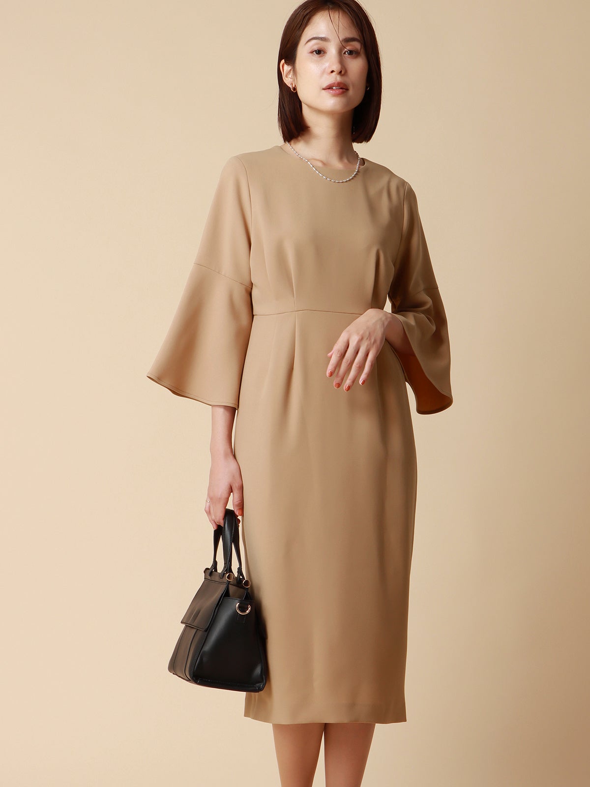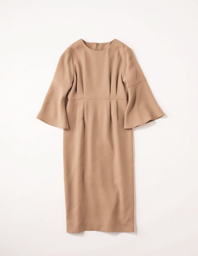 袖をフレアにすることでシンプルながら華やかな印象。ウエストの切り替え位置を高めに設定することで脚長効果を実現。