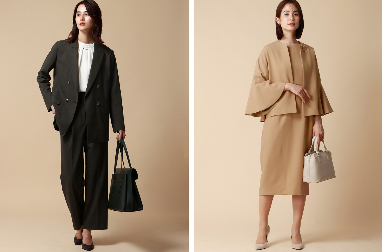 アンケートの結果から服装を選ぶ際、約6割の方が「コーディネートのマンネリ化」を感じていて、仕事服では、スタイルがよく見える着やせシルエットやデザインを重要視していることが明らかになりました。そこで今回は、“着回し”と“着やせ”をキーワードにON・OFFや、オケージョンでも着回しができて、ウォッシャブル機能やストレッチ性も備わっている「ハンサムスーツスタイル」と「華やぎオケージョンスタイル」の2パターンを企画しました。