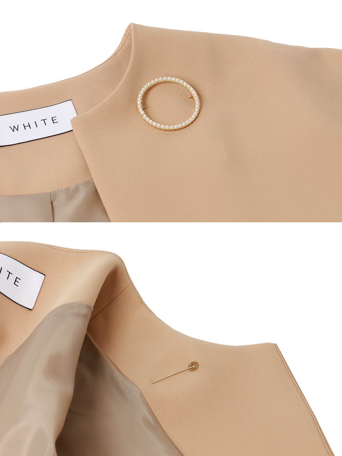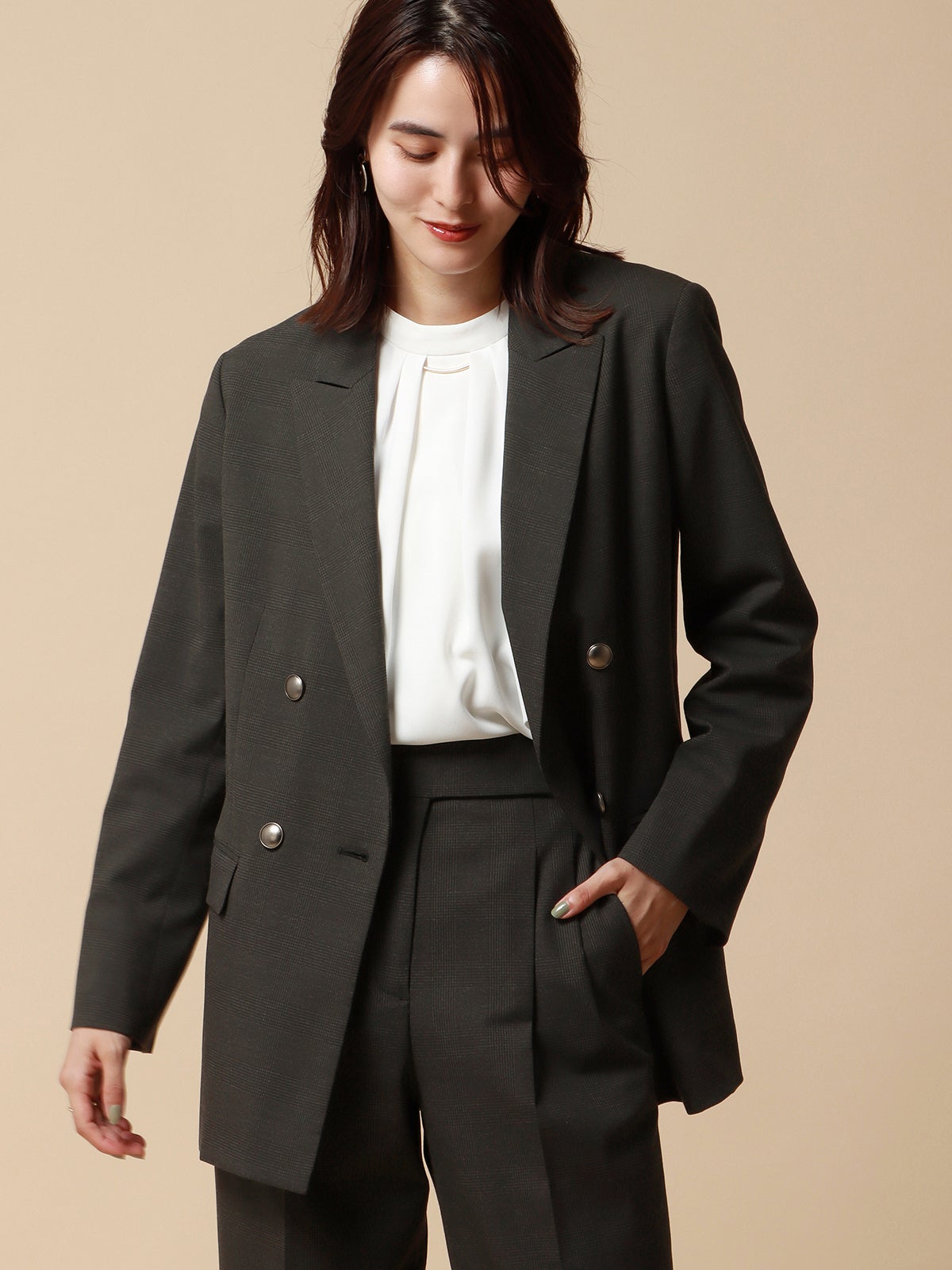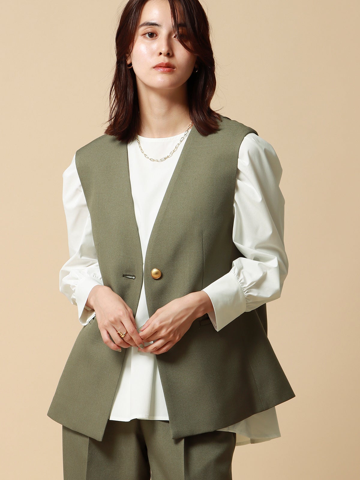 程よいゆとりを持たせたボディーと、深すぎず・浅すぎないVゾーンでマニッシュになりすぎずに着用可能。後ろに入れた肩タックがバックスタイルにも表情をプラス。