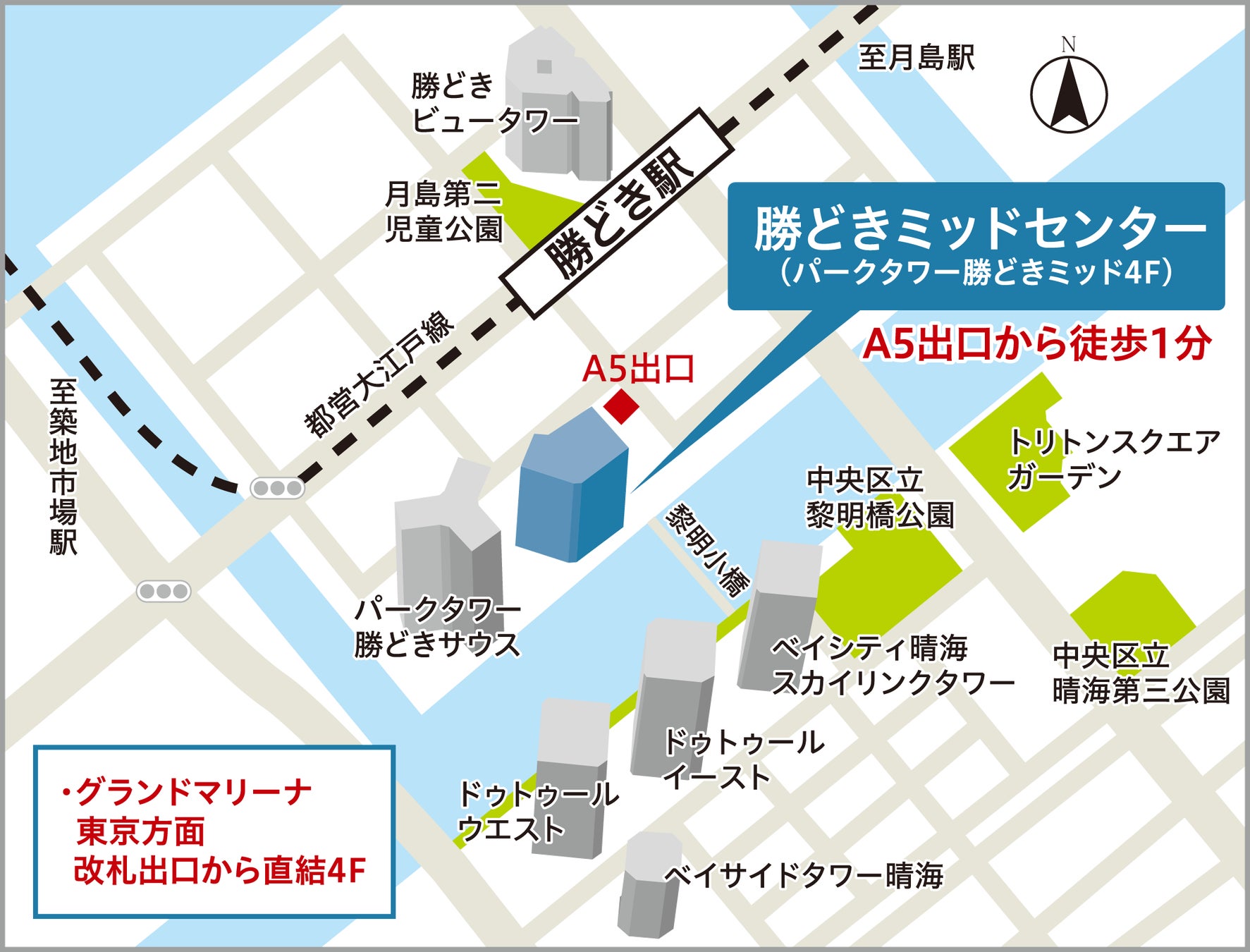 勝どきミッドセンターは、都営大江戸線「勝どき」駅より徒歩1分(駅直結)に位置するタワーマンション「パークタワー勝どきミッド」の4階に出店いたします。