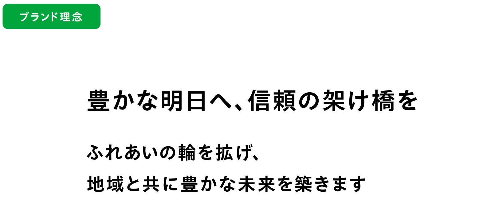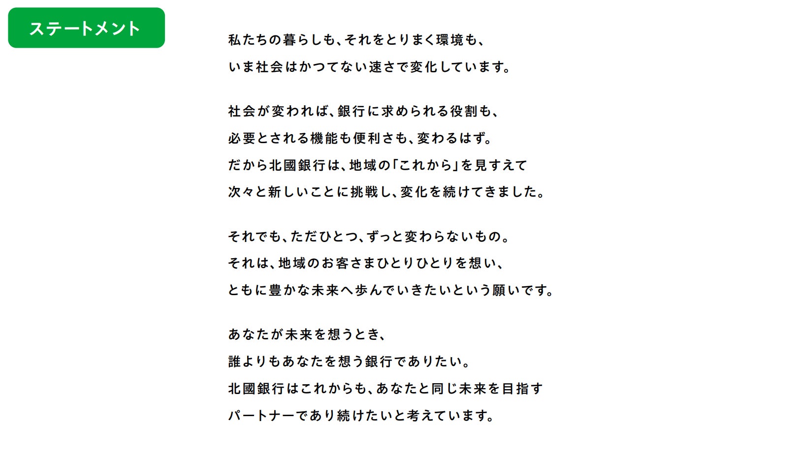 また、北國銀行の商号・ロゴの変更はございません。創業からの企業理念である「豊かな明日へ、信頼の架け橋を~ふれあいの輪を拡げ、地域と共に豊かな未来を築きます」を今後も大切にしながら、地域金融機関としての価値を提供し続けてまいります。これまで以上に、お客さま、地域の皆さまの「想い」に寄り添い、対話を深め、地域の未来と皆さまに貢献します。その決意として、今般新たなスローガンを制定します。