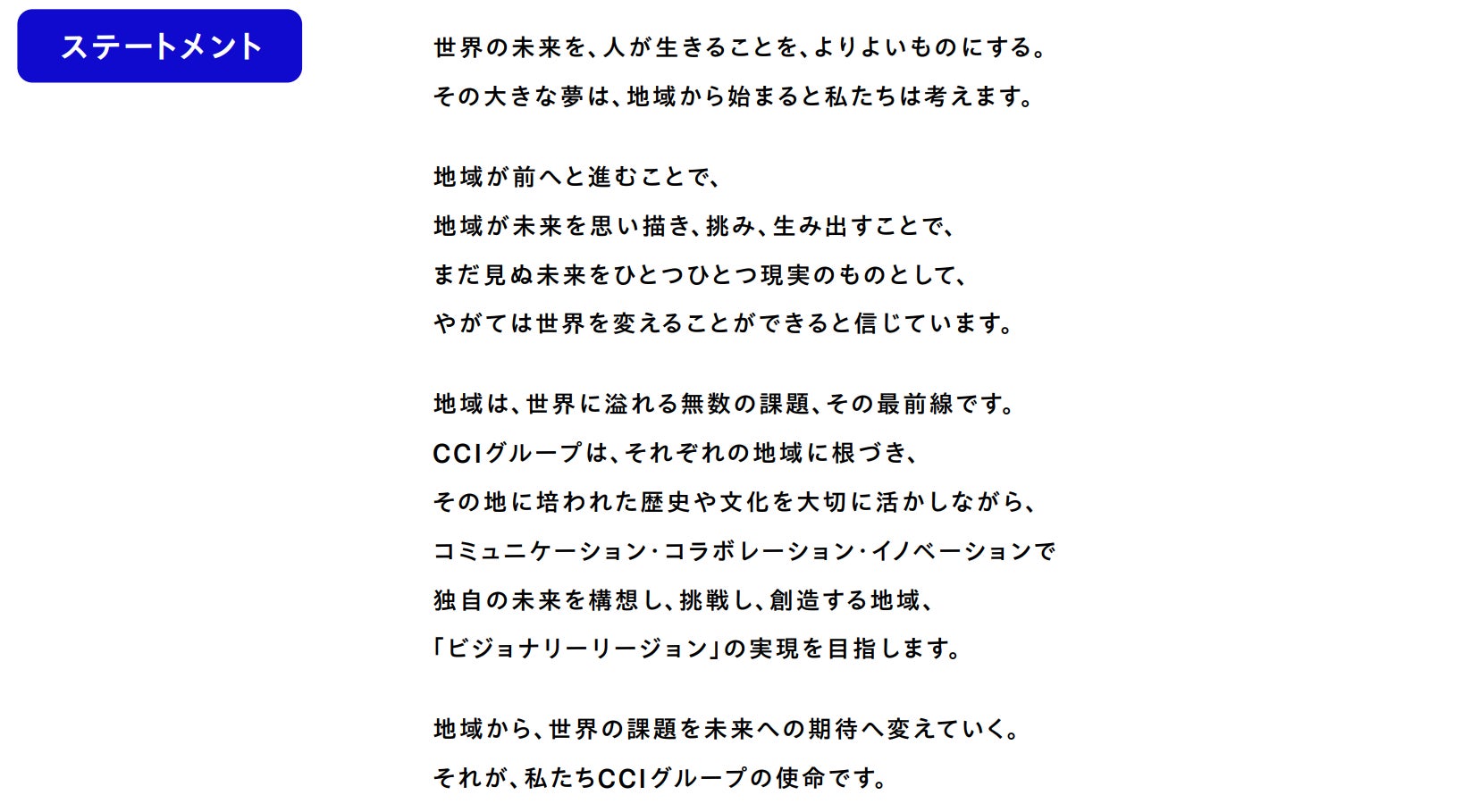 当社の組織文化を表す「CCI」(コミュニケーション、コラボレーション、イノベーション)と、持株会社グループ体制を表す「グループ」で構成しました。コーポレート・ブランドロゴは、中心のスペースをRegion(地域)に見立て、地域が輝き、世界へ広がっていく姿を表現しました。