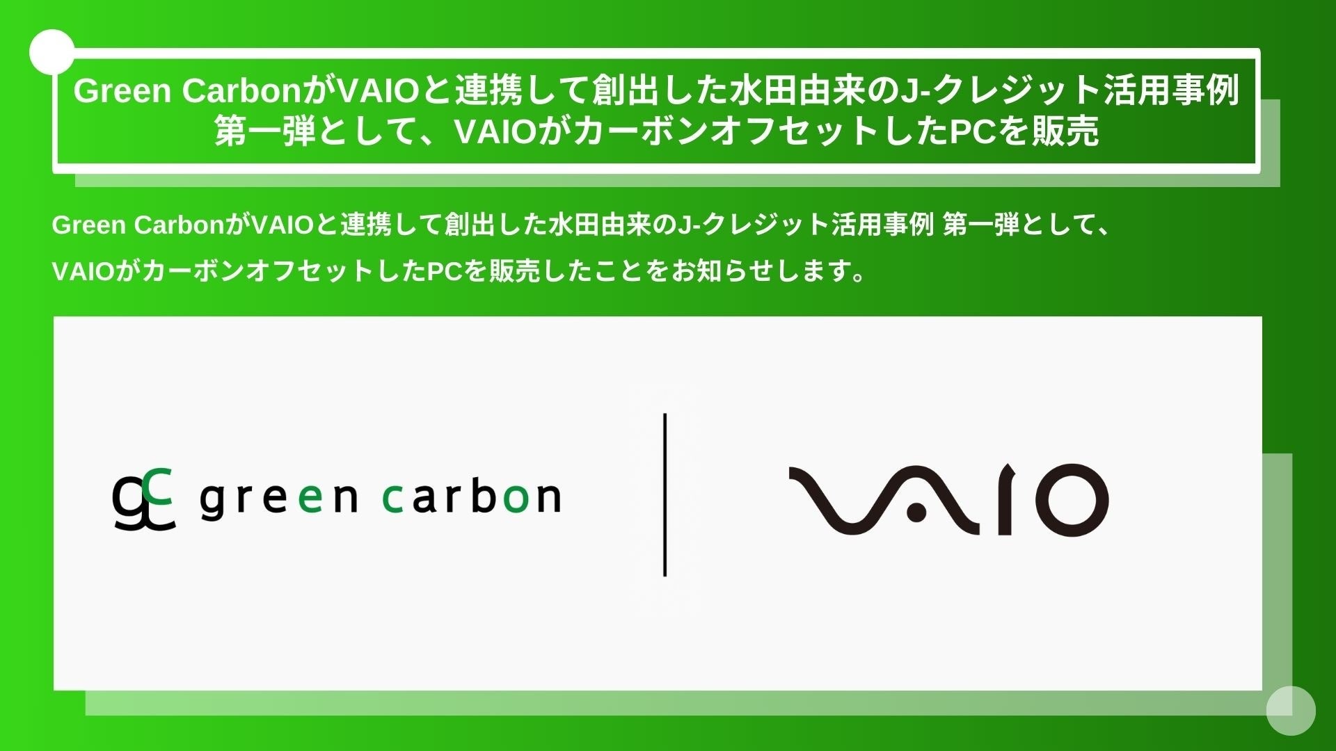 Green Carbon株式会社(代表取締役:大北潤、以下Green Carbon(読み;グリーンカーボン))はVAIO 株式会社(代表取締役社長:山野 正樹、以下VAIO)と、水田の中干し期間延長によるJ-クレジットを長野県安曇野市で創出しました。この度、VAIOがこのJ-クレジットを活用し、 PC製造時の排出量とカーボンオフセットさせたPCの取り扱いを開始したことをお知らせします。