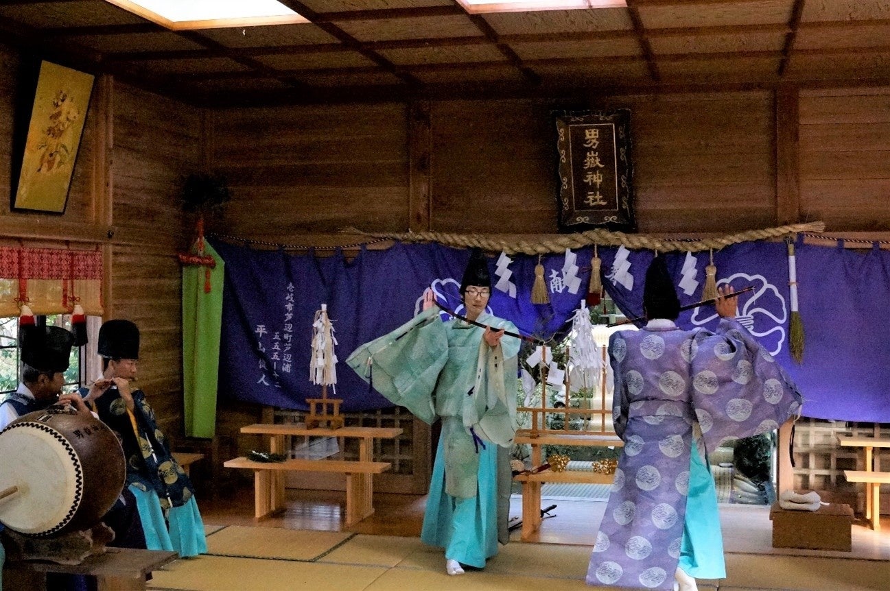 古来より神々とのゆかりが深い場所として語られてきた壱岐島には、神社庁に登録されているものだけでも150社以上の神社があります。約700年の古い伝統と歴史を誇る「壱岐神楽」は、国指定重要無形文化財に指定され、壱岐の神社に奉職する神職にしか舞うことや演奏することが許されない、きわめて神聖な神事芸能です。秋から冬にかけて、島内の各神社では毎日のように神楽が奉納されます。12月20日には、住吉神社で約6時間にわたり大大神楽が行われ、夜には境内が緑色にライトアップされ神秘的な雰囲気を感じることができます。