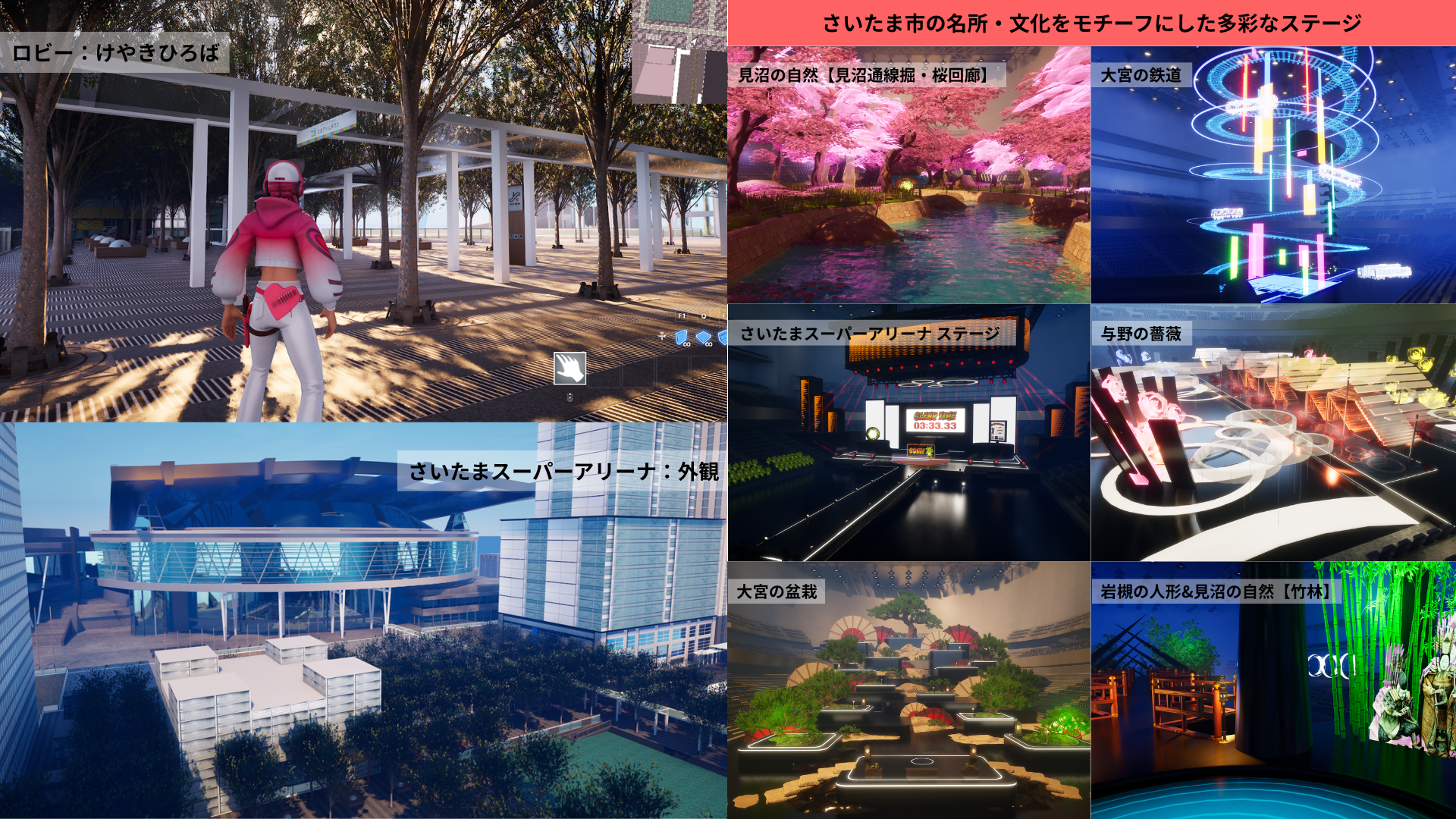 ▼さいたま市の都市空間と文化を再現:3D都市モデルでさいたま新都心をリアルに再現し、市内の名所・文化がテーマのステージも登場。