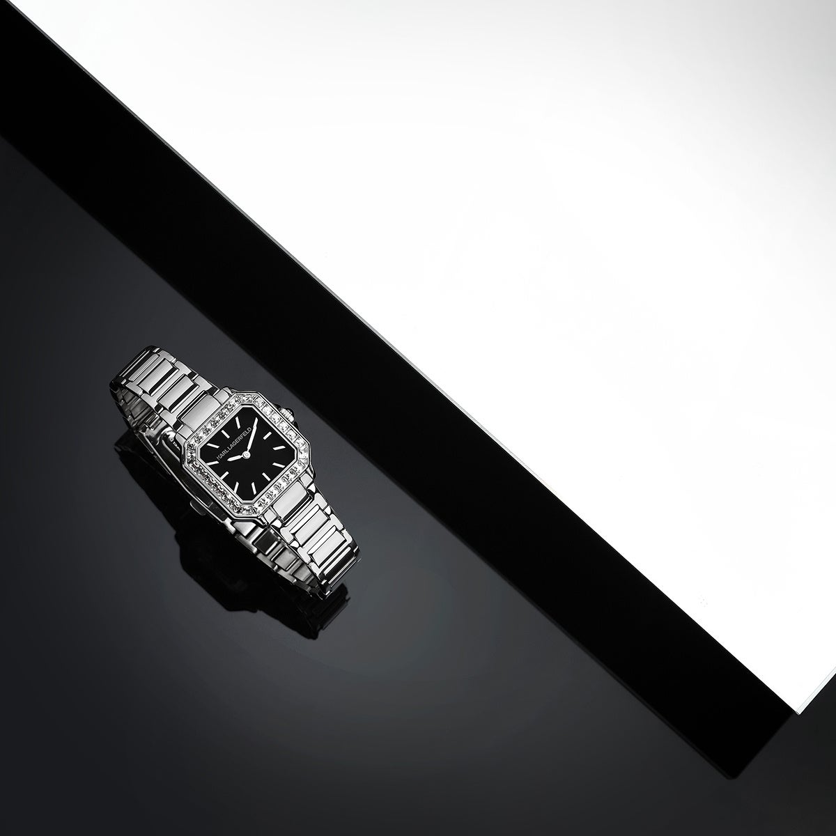 スクエア型のクリスタルベゼルが輝きを放つモデル。ブレスレット中央にはファセットカットのディテールを施し、クラウンにはブラックエナメルのカボションをセット。ダイヤルにはサンレイ加工やダイヤモンドダスト仕上げが施され、モダンなエレガンスを演出します。