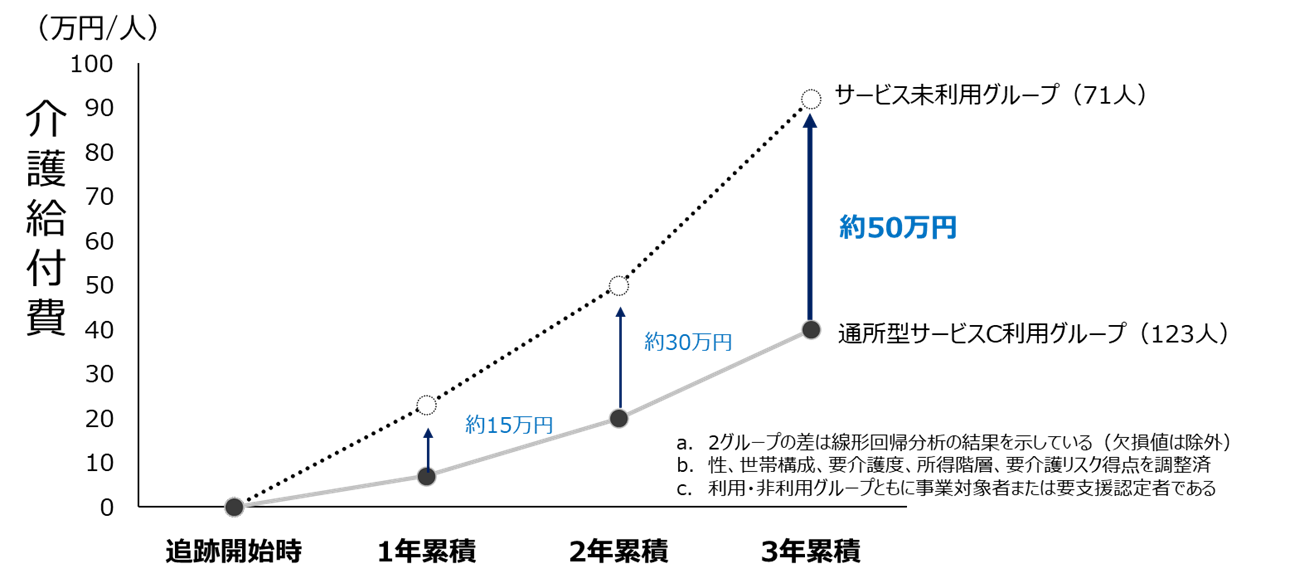 (結果2):利用グループの3年間の1人あたりの介護給付費は未利用グループを基準に約50万円低い