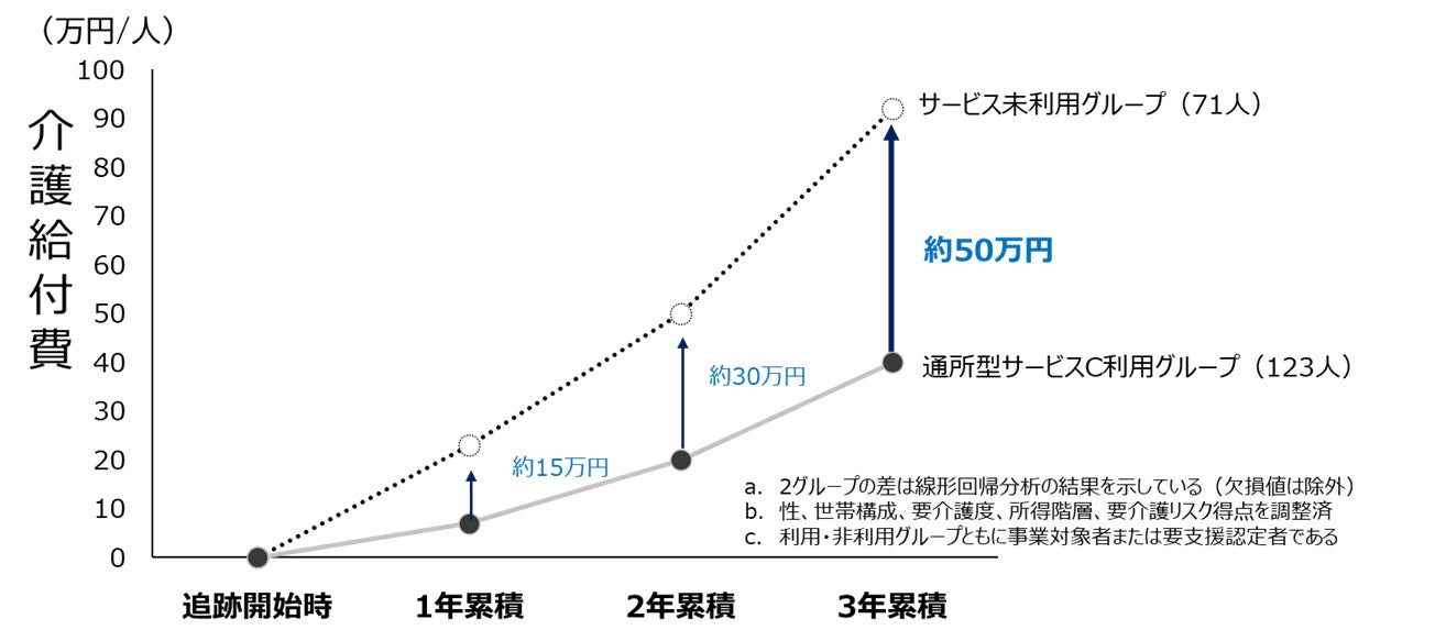 このことから、通所型サービスCは利用者の要介護リスクの低減を促し、介護給付費適正化に寄与する可能性が明らかになりました。今後は、この要介護リスクの低減効果がどのような利用者に顕著であったかを深掘りしていくとともに、JAGES機構および日本福祉大学が用いた全国規模の介護給付費データベースとの比較を行うなど検証を継続していく予定です。