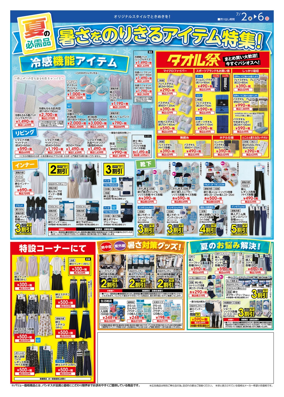 チラシ裏面では、暑さをのりきる[冷感機能]が付いた、リビングアイテムやインナー、靴下を集めた特集を開催いたします。