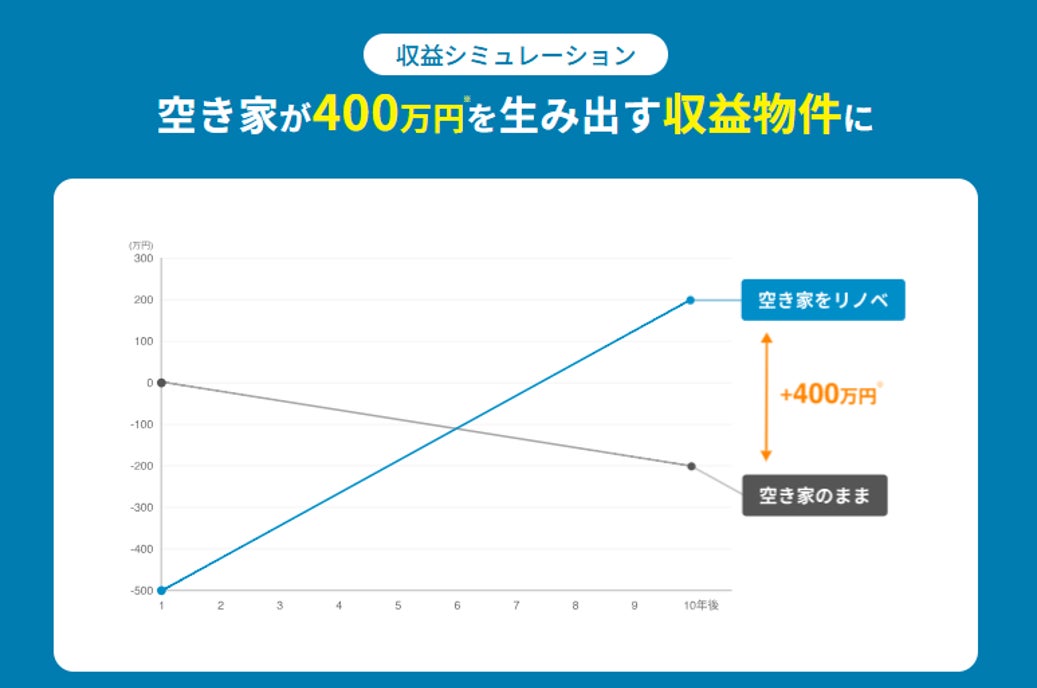 当社が現地調査からリノベーション、入居者募集、運用管理まで一貫して行うため、オーナーは手間をかけずに安定した家賃収入を得ることができます。10年間で約400万円※の利益(実質+400万円)を生み出すシュミレーションも算出されています。