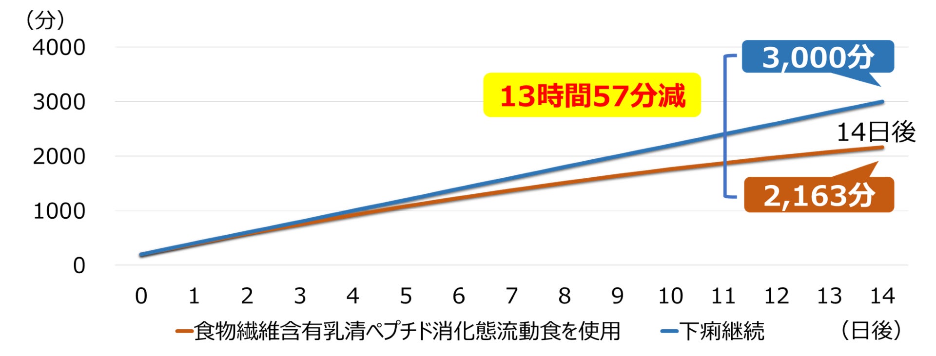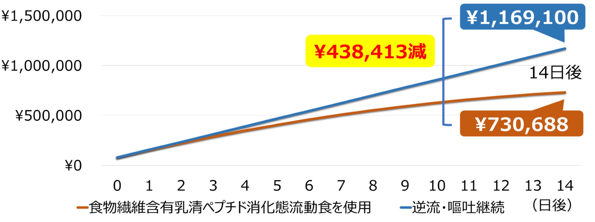 追加業務時間(10人あたり14日後までの累計値)をシミュレーションした結果、食物繊維含有乳清ペプチド消化態流動食使用により、下痢発生時のコストは約56,000円、業務時間は約14時間減少、逆流・嘔吐発生時のコストは約440,000円、業務時間は約132時間減少すると推計されました。