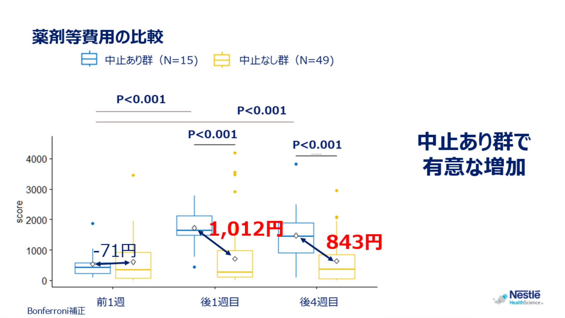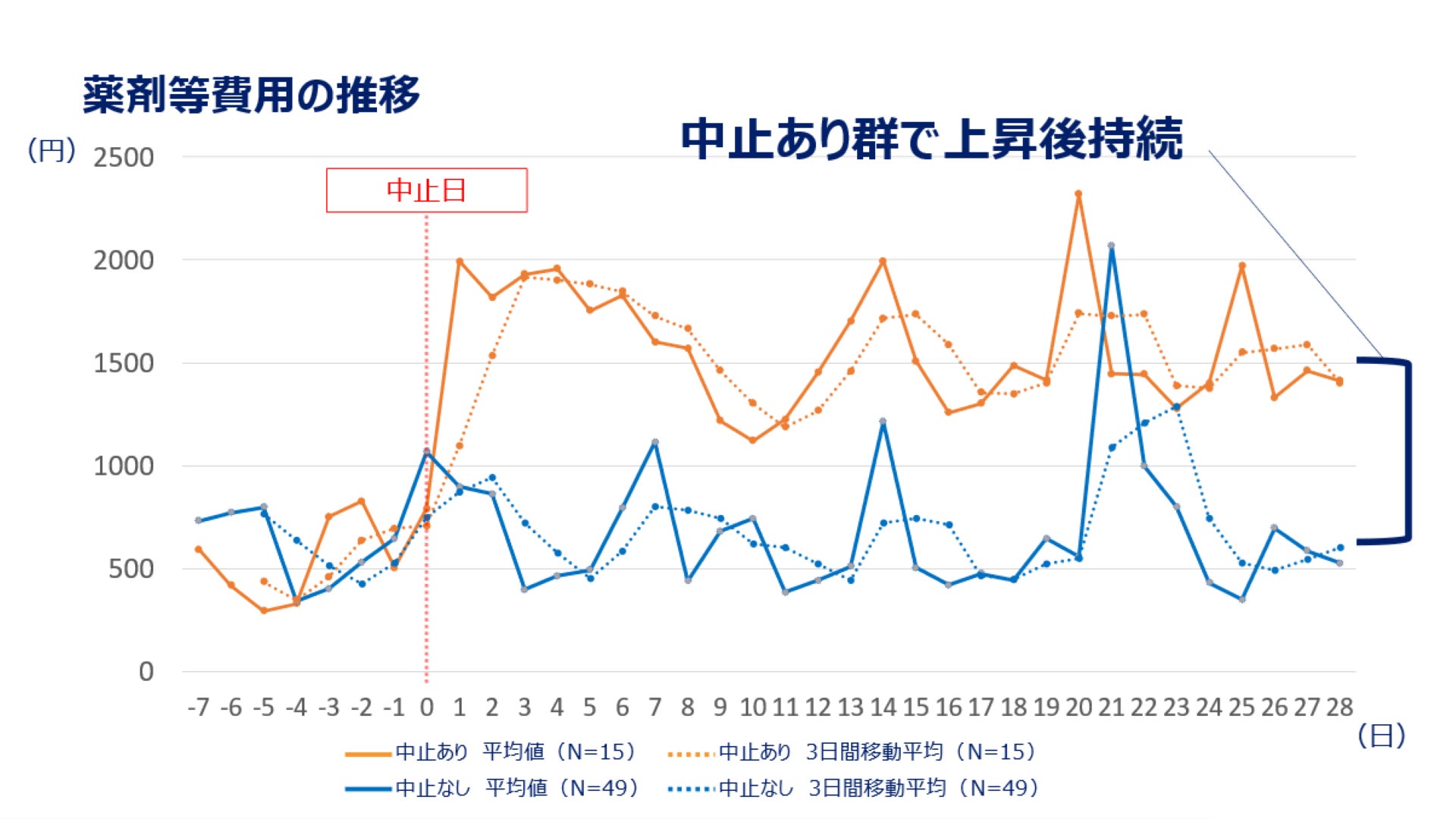 不耐症による予期せぬ経管栄養中止があった群では、中止日を境に薬剤等費用が急増し、その後、中止、28日後まで元に戻ることはありませんでした。 経管栄養中止あり群の薬剤等費用は経管栄養中止前に比べて中止後に有意に増加し、中止なし群と比べて有意に高い金額となりました。