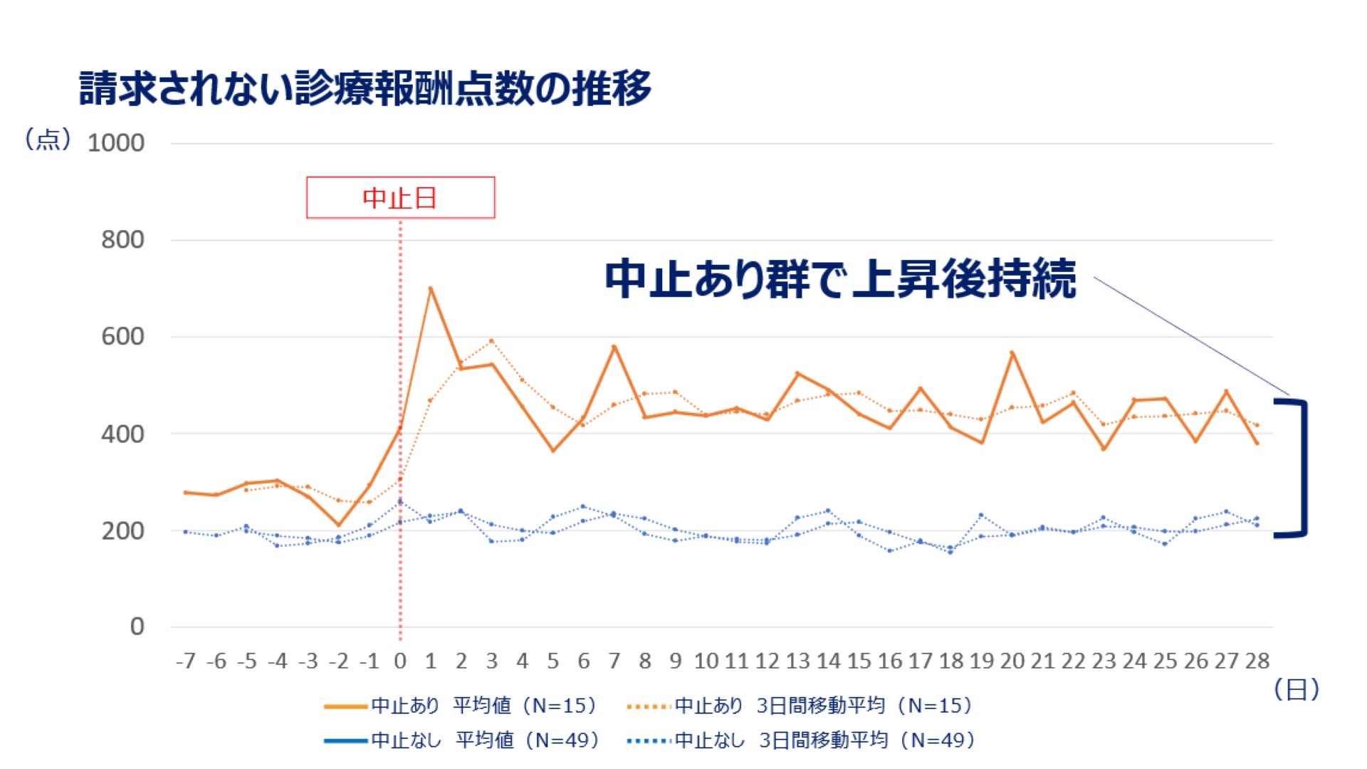 不耐症による予期せぬ経管栄養中止があった群では、請求されない診療報酬点数(出来高換算点数とレセプト請求点数の差分、いわゆる持ち出し分)が経管栄養中止日に急増し、その後、中止28日後まで元に戻ることはありませんでした。一方で、中止なし群は分析期間中、大きな変化はありませんでした。療養病棟では、患者分類に基づく包括された診療報酬設定となっており、本結果から不耐症による予期せぬ経管栄養の中止により、病院収入に繋がらない診療行為が増加したことが推察されました。