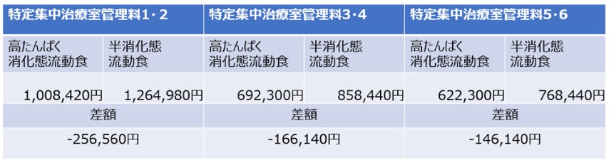 評価項目:高たんぱく消化態流動食使用時および半消化態流動食使用時の医療費(特定集中治療室管理料)