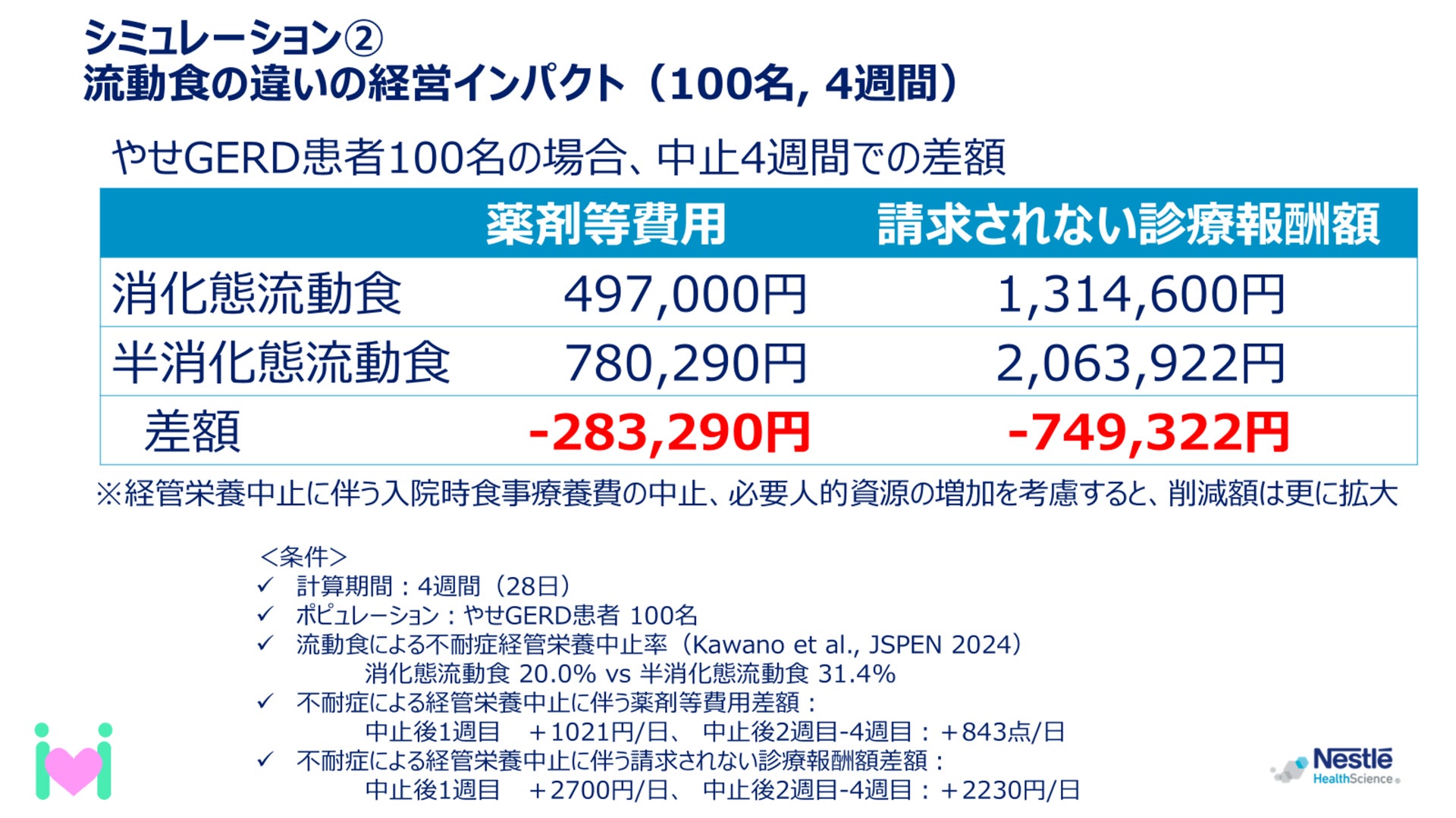 また、流動食の違いによる経管栄養中止率の違いをもとに、やせ状態のGERD患者100名を想定した場合の入院4週間でのコストをシミュレーションすると、経管栄養に乳清ペプチド消化態流動食を用いた場合、半消化態流動食に比べて薬剤等費用が約28万円、請求されない診療報酬額は約75万円安くなると推計されました。
