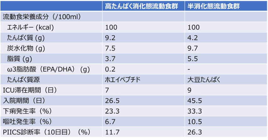 高たんぱく消化態流動食と半消化態流動食を比較したランダム化比較試験(Nakamura K et al., Clin. Nutr. 2021;40:796-803.)によると、ICU(Intensive Care Unit、集中治療室)の入室日数は