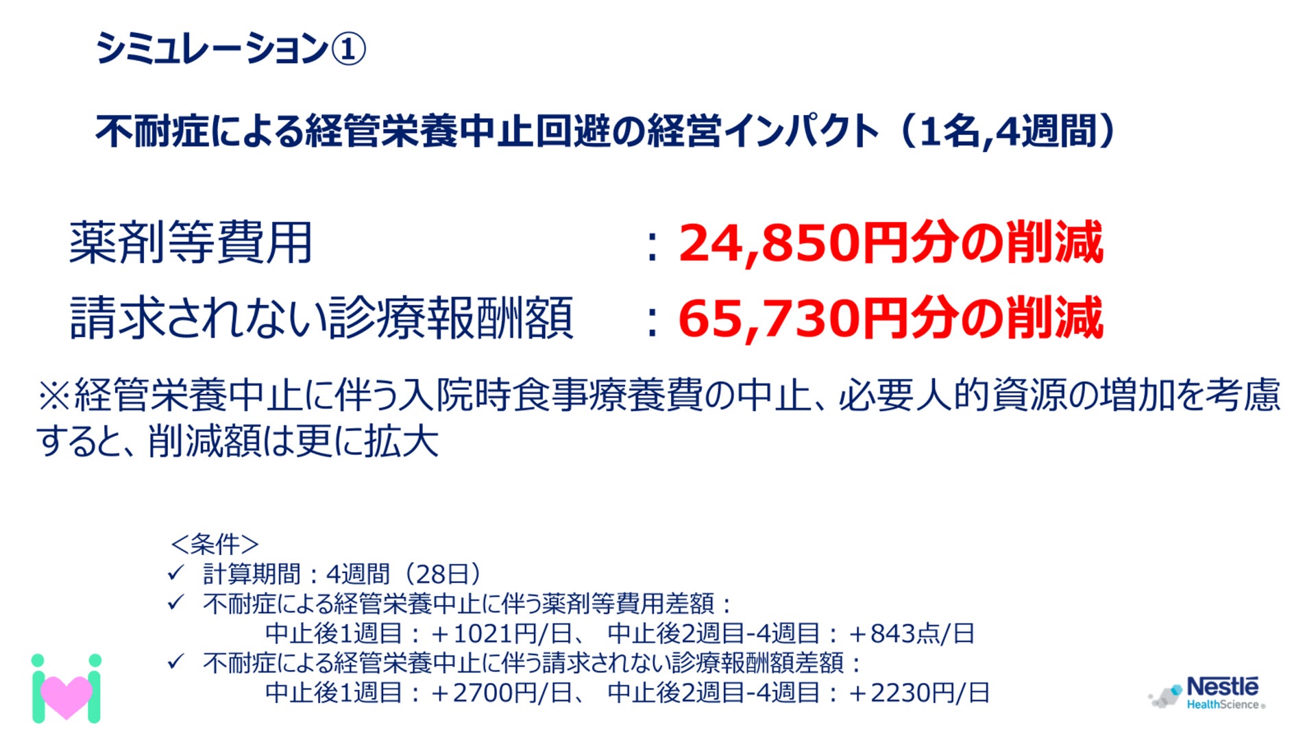 不耐症による予期せぬ経管栄養中止を回避できれば、コスト削減インパクトがある