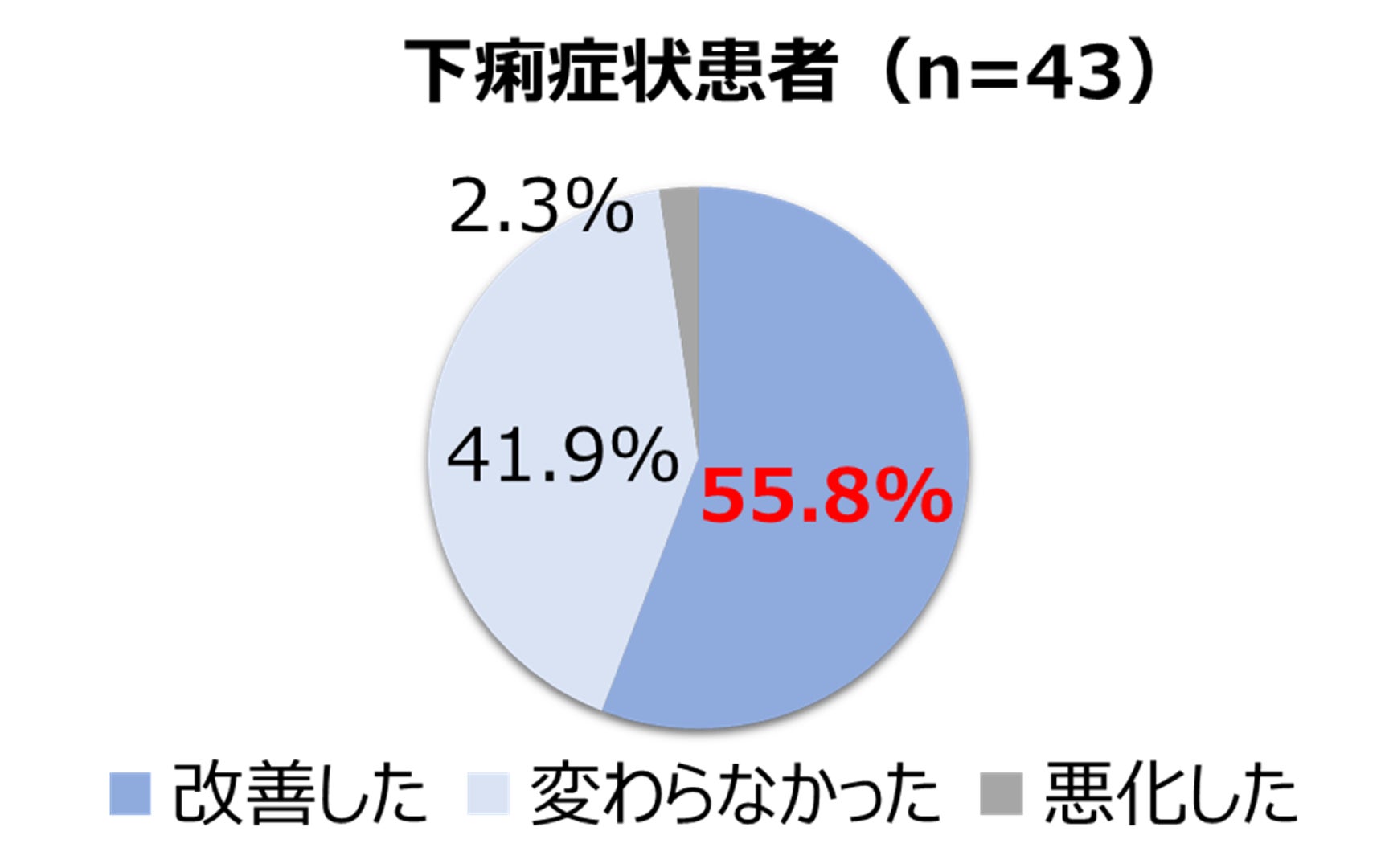 我々が実施した調査結果から、食物繊維含有乳清ペプチド消化態流動食は平均14日間の使用で下痢を55.8%、逆流・嘔吐を75%改善する事が確認されています。