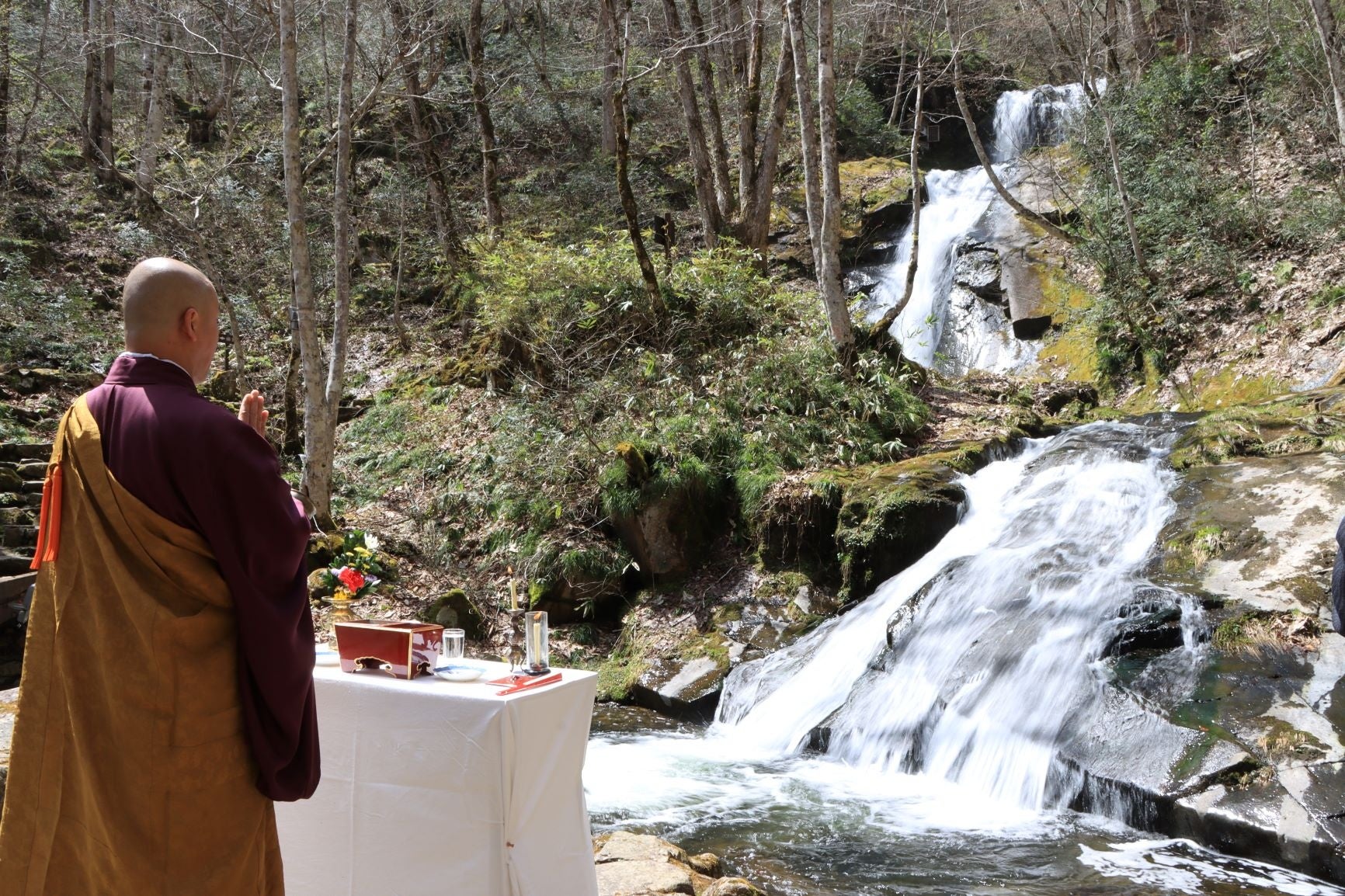 観光シーズンの幕開けを告げる、この時期恒例の滝開きは、今年は4月17日(水)に行われ、上流にある高さ約3メートルの「平滝」の前で関係者約30人がシーズン中の来訪者の安全を祈願しました。