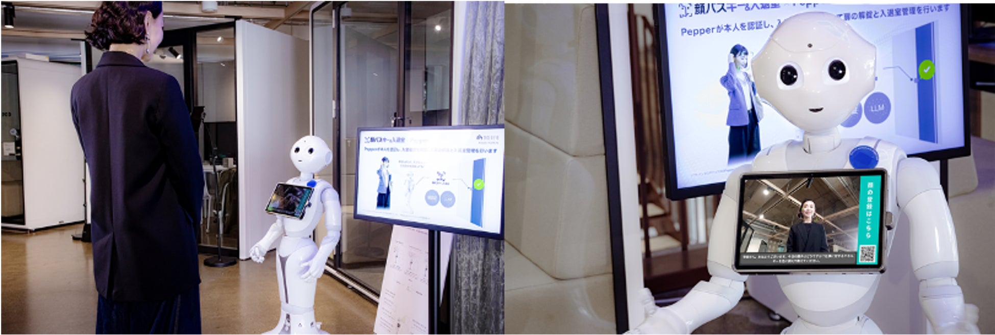 本ソリューションでは、企業のエントランスなどに設置された「Pepper+」が来訪者や社員の顔を認証し、認証結果に基づいた案内や受付対応を実行します。