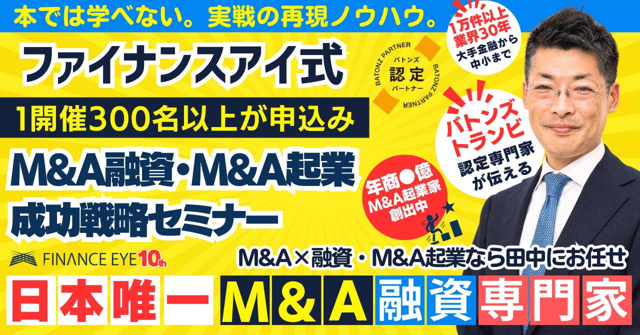 M&A融資・資金調達や個人向けM&A起業の支援では日本唯一の株式会社ファイナンスアイ(所在地:大阪市、代表:田中琢郎)は、M&Aの買手向けに買収資金を増やしたい起業家・個人事業主・中小企業の経営者に向けて特別なセミナーを開催致します。『M&A×融資を成功させるには?M&A×融資の専門家が成功する案件選定。銀行が評価するM&A戦略~社長の連帯保証無し!無担保で最大7200万円!日本政策金融公庫の新規開業資金(創業融資)を活用する。』(※参加者の顔出しナシ)と題したこのセミナーでは、日本国内M&A成約数1位のBATONZ(バトンズ)認定パートナー/認定アドバイザー/認定DD調査人、国内最大級のM&AサイトTRANBI(トランビ)提携のM&A支援の認定専門家である田中琢郎社長自らが、1万人以上の起業家や経営者を支援した実戦経験をもとに、M&A起業やM&A買収資金にも使える、新規開業資金(創業融資)を成功させるポイントやM&A×融資を成功させるための案件選定基準を分かりやすくお伝えします。セミナー中には大量のM&A案件の中から実際にM&A✕融資が成功するかどうかを専門家が鑑定します。本セミナーは、2024年7月31日(水)19:00より、オンラインZOOMで開催します。コロナ禍を乗り越え、億超えの起業家を生み出し続けたファイナンスアイが、良い案件も悪い案件も1万人以上をリアルに支援したから分かる融資審査の本音と建前、M&Aのオカネとリスクの解決策を分かりやすく伝えます。セミナーでは田中社長とライブで質疑応答ができるので厳格化する融資審査を乗り越えるために具体的なアドバイスが欲しい人はチャンスです。セミナー申込時の受付フォームで事前質問に記入してもらえれば、セミナー中に回答できそうにない内容でも別途具体的なアドバイスを受けられます。この機会に誰にも相談できなかった悩みや疑問を解決しましょう。