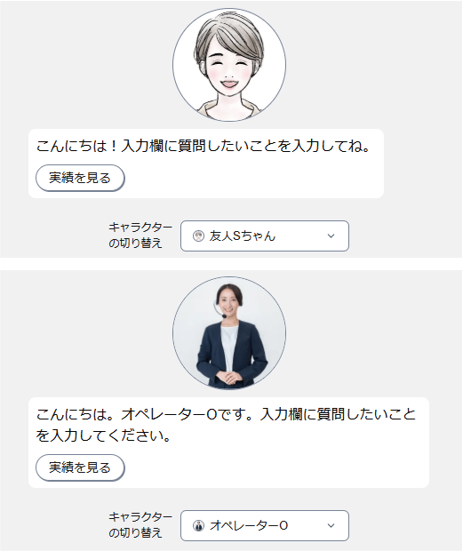回答キャラクター(アバター画像、性格、話し方)を複数設定でき、ユーザーは任意のキャラクターを選んで質問できます。口調や雰囲気を自在に設定できるため、人による接客とシームレスにつながる、一貫したブランドイメージを活かした差別化が可能です。回答キャラクターを選べるエンタメ性も備え、親しみやすいユーザー体験を提供します。
